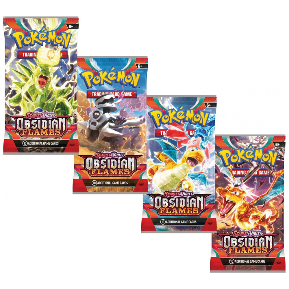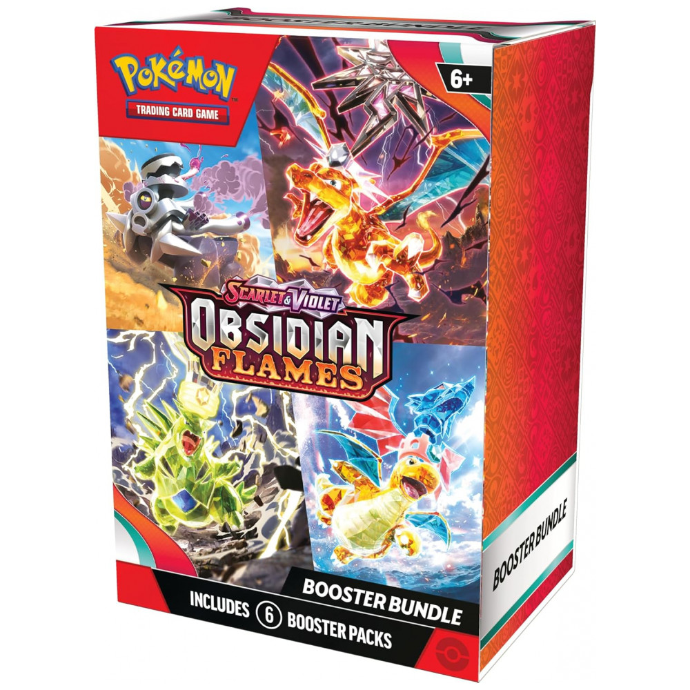 O pacote de boosters Pokémon TCG Scarlet & Violet Obsidian Flames Booster Bundle é um conjunto com seis boosters da expansão Obsidian Flames da linha Scarlet & Violet, indicado para ampliar coleções e reforçar baralhos do Pokémon Trading Card Game com cartas da terceira série da geração. Cada booster contém cartas aleatórias, incluindo Pokémon, cartas de Treinador e Energia básica, com possibilidade de obtenção de cartas raras, holo e Pokémon ex.