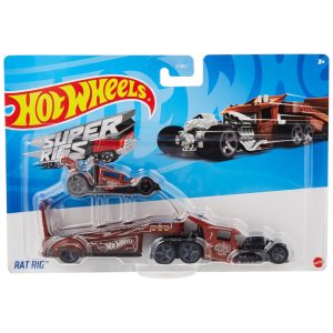 Caminhão Hot Wheels Super Rigs com Carro de Corrida em escala 1:64 e Estilo de Transportador Mattel.