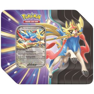 Lata Pokémon TCG Slashing Legends com Carta Promo Zacian ex ou Koraidon ex e 5 Boosters