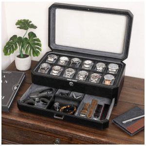 Caixa Estojo de Couro e Visor de Vidro para Relógios com 12 Compartimentos ROTHWELL Cinza e Laranja