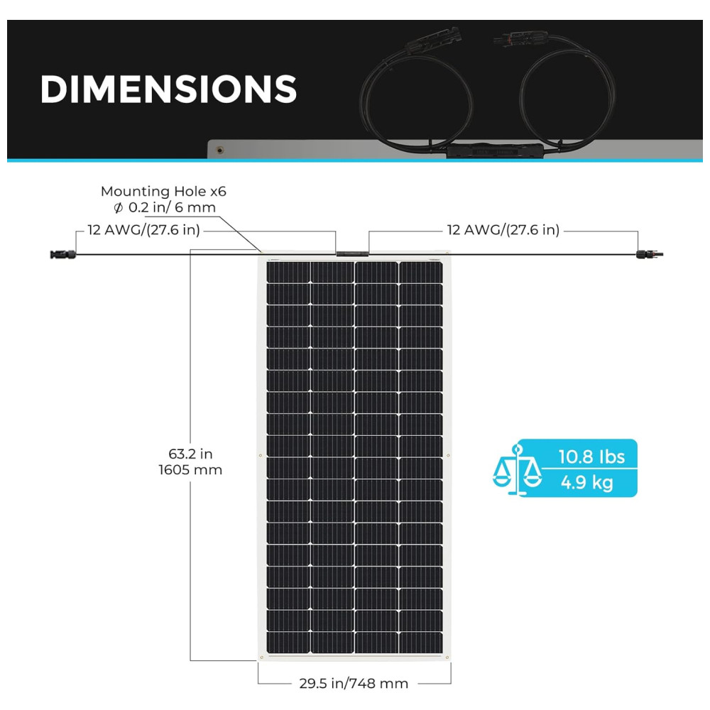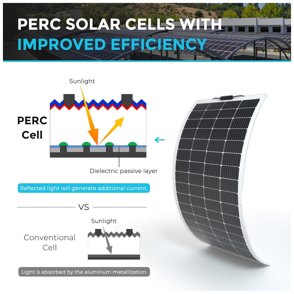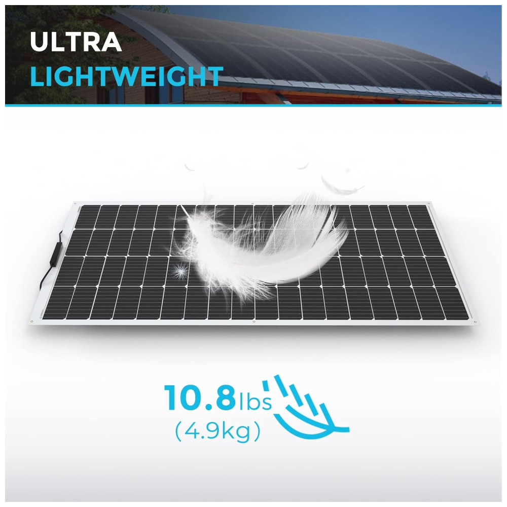 O Painel Solar Monocristalino Flexível Renogy 200W é uma excelente opção para quem busca alta potência de saída. Com capacidade média de fornecer 1000 Watt horas de eletricidade por dia, calculado com 5 horas de luz solar, é um produto eficiente e econômico. Além disso, é fácil de transportar e instalar, adaptando se à maioria das superfícies curvas, pois é dobrável em 240 graus. Com peso de apenas 12 do painel rígido e aparência totalmente preta e sem brilho, é discreto e elegante. Equipado com tecnologia de célula PERC halfcut, que melhora a captura de luz solar e o desempenho elétrico, este painel solar apresenta tecnologia líder da indústria. É confiável e durável, funcionando com caixa de junção à prova d água com classificação IP67 e conectores solares, suportando até 5.400 Pa de carga de neve pesada e até 2.400 Pa de vento forte. Pronto para instalação, o painel vem com furos de montagem pré perfurados e cabos conectores solares longos de 12 AWG 27,6 pol., possibilitando instalação rápida e fácil.