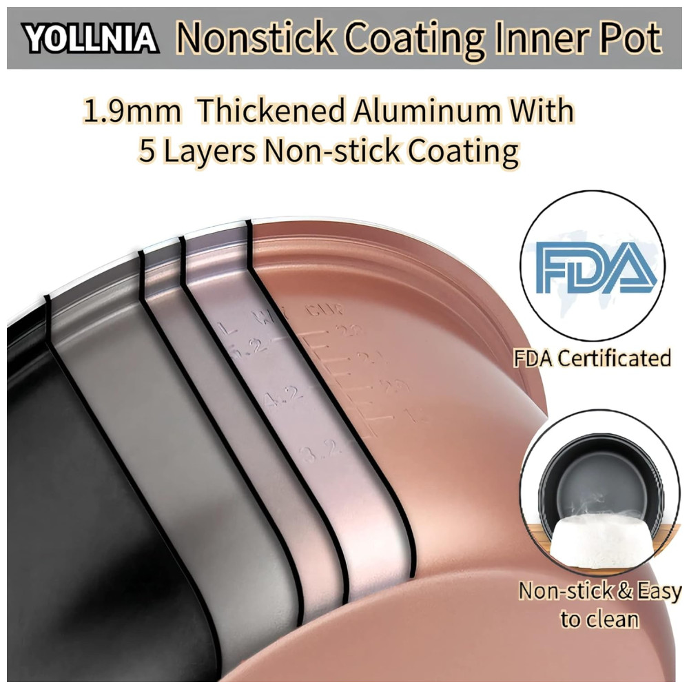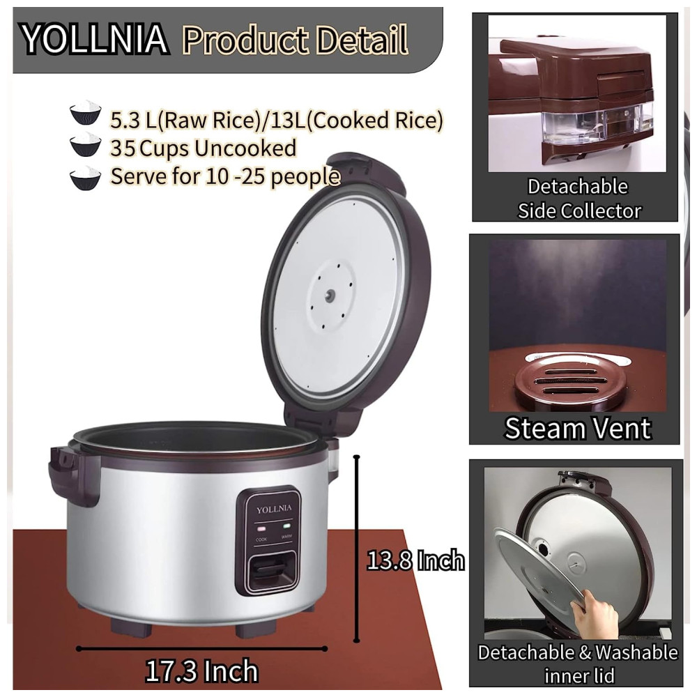 A panela de arroz Yollnia possui uma grande capacidade de 13L que pode cozinhar 35 xícaras de arroz cru ou 65 xícaras de arroz cozido e é capaz de servir mais de 25 pessoas para uso e também para festas privadas.