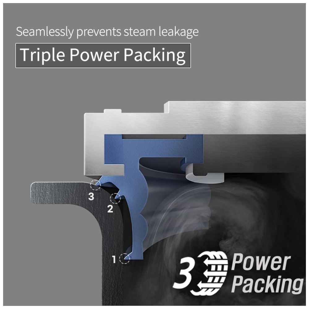EMBALAGEM DE POTÊNCIA TRIPLA: Veda efetivamente qualquer vazamento de vapor com uma embalagem de potência tripla.