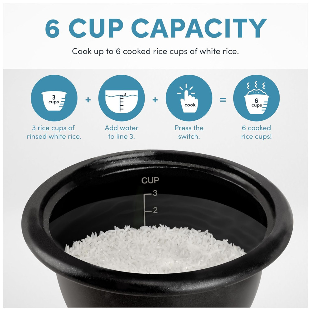 6 Xícaras Cozidas: Perfeito para arroz fofinho e grãos saudáveis. O arroz dobra de tamanho, transformando 3 xícaras de arroz cru em 6 xícaras cozidas com um toque.