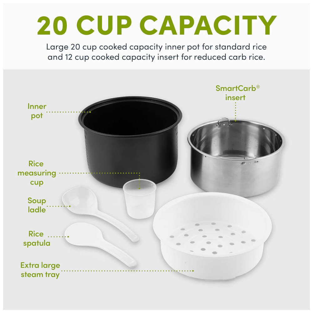 Redução de carboidratos: A panela de arroz vem com uma panela de aço inox que remove até 30% dos carboidratos do arroz, permitindo cozinhar uma variedade de grãos e arroz sem perder nutrientes.