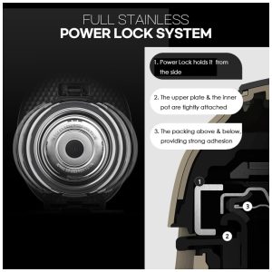 Ela também é segura, com um sistema de bloqueio de energia totalmente inoxidável que oferece uma experiência de cozimento segura, mesmo sob condições de alta pressão e alta temperatura. Além disso, possui uma tampa de vapor silenciosa e um botão de menu de um toque.