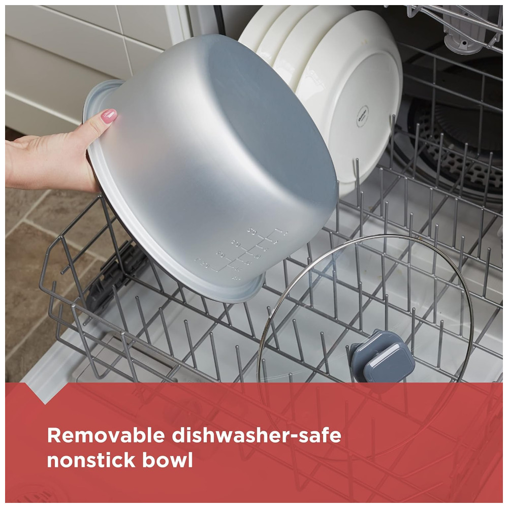 Panela de arroz antiaderente de arroz antiaderente é totalmente removível para fácil limpeza na máquina. As dimensões são 25 x 22 x