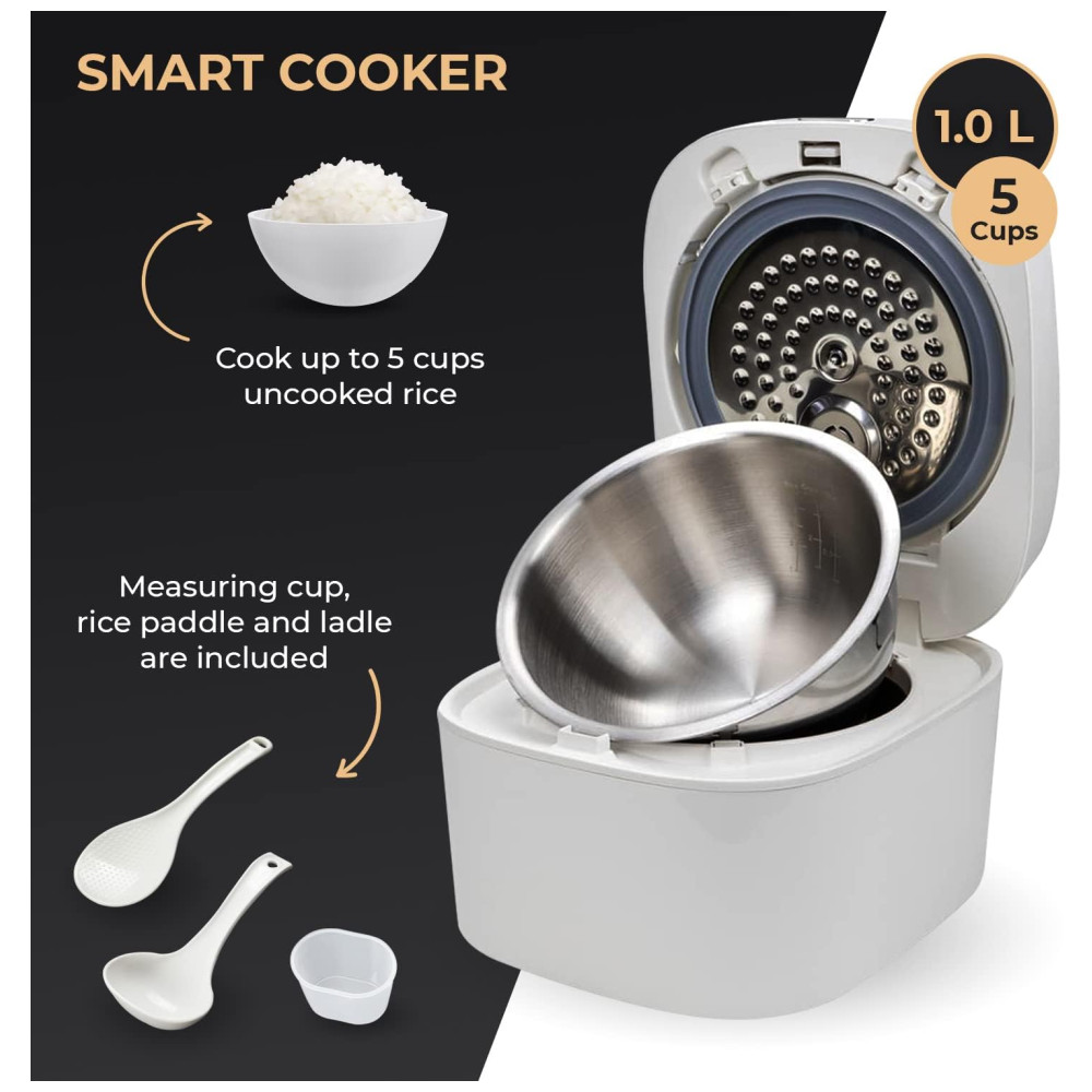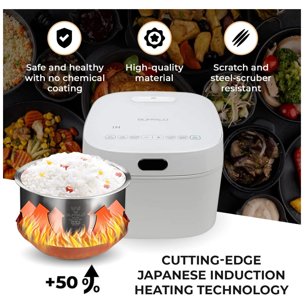 Controlador micro inteligente que mede automaticamente a quantidade de arroz e permite cozinhar com controles inteligentes de temperatura e guisado de micropressão que mantém a nutrição natural e o sabor .