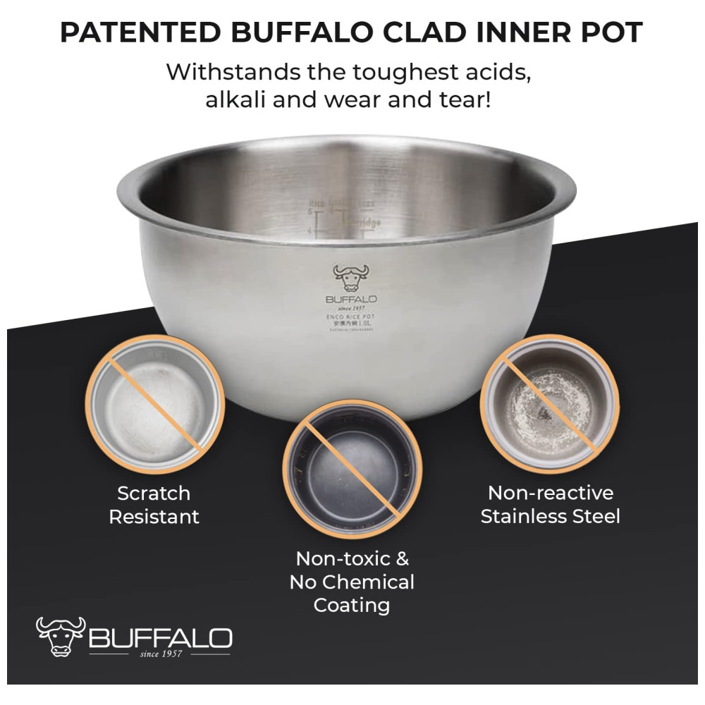 O pote interno é feito de Buffalo Clad que é resistente à oxidação, antiaderente e não possui revestimento químico