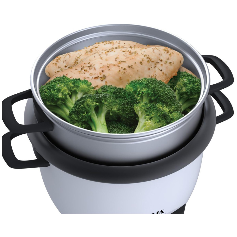 Inclui bandeja de vapor, copo medidor de arroz e espátula de servir
