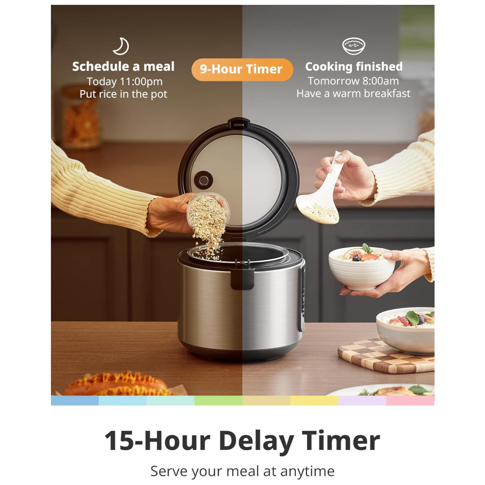 Operação sem esforço A panela de arroz programável multiuso é amigável com painel digital e display LED, possui 6 programas de um toque, muda automaticamente para se aquecer por 12 horas e o temporizador de atraso de 12 horas é projetado para um planejamento flexível de refeições.
