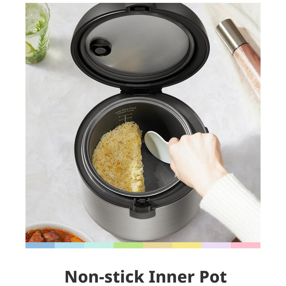 Fácil de limpar A caixa externa de aço inoxidável é fácil de limpar. Com o revestimento antiaderente, a limpeza da panela interna é como uma brisa. A panela interna e todos os acessórios incluídos podem ser lavados na máquina de lavar louça.