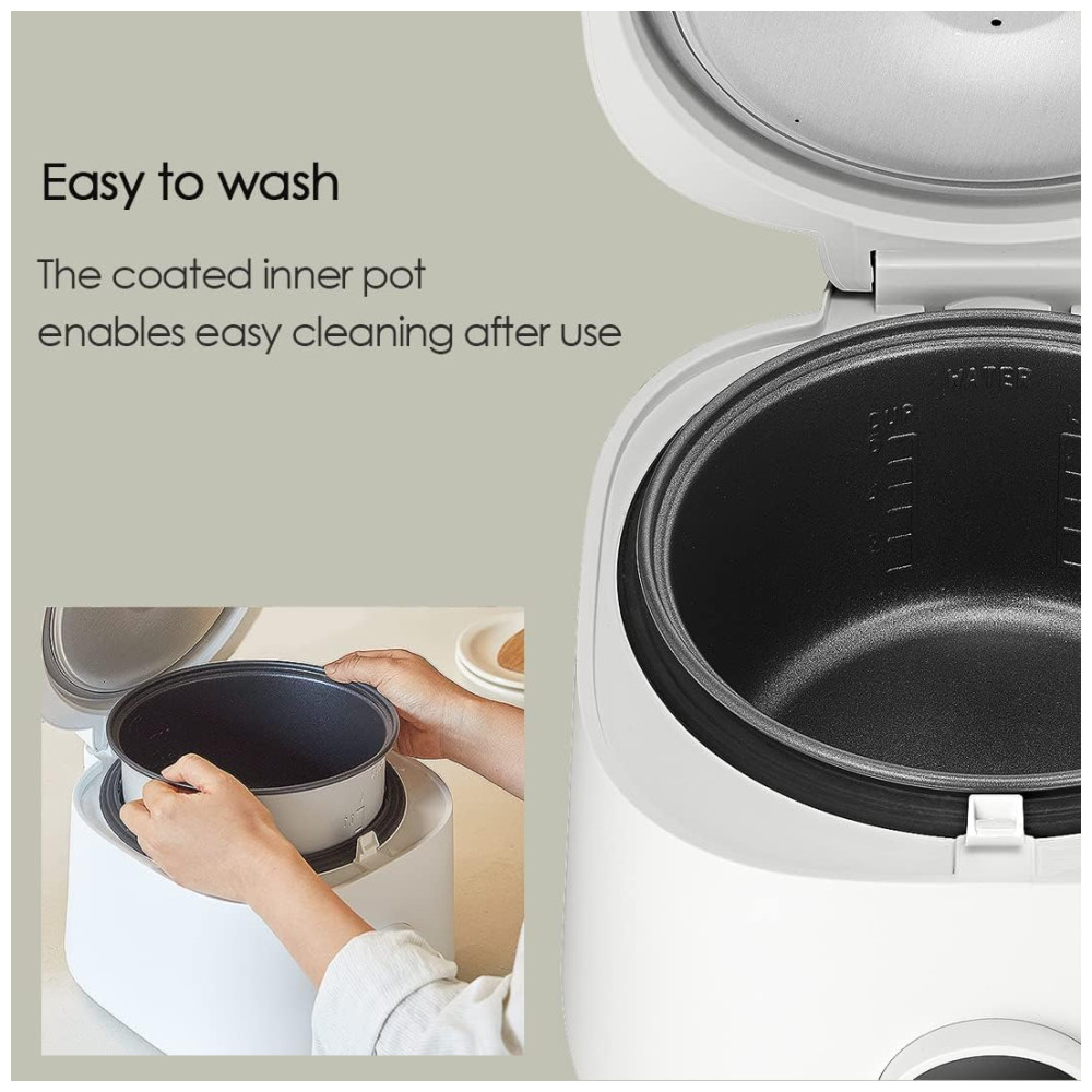 Este produto é uma panela elétrica de arroz com capacidade para 6 xícaras, ideal para pequenas reuniões ou famílias de pequeno a médio porte. Possui um botão onetouch que facilita o início do processo de cozimento do arroz, além da função quente automático que mantém o arroz pronto para servir por horas após o ciclo de cozimento. A panela interna é antiaderente, o que facilita a limpeza, e a tampa é removível. É importante consumir o arroz em até 12 horas após o cozimento. O produto também possui um fusível de temperatura instalado para evitar possíveis riscos de incêndio causados por superaquecimento. A compra inclui a panela elétrica de arroz, espátula de arroz e copo medidor de arroz.