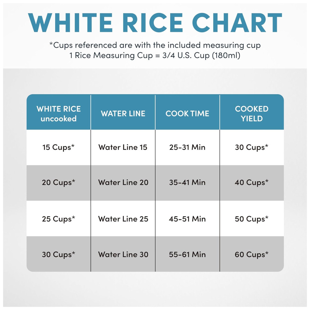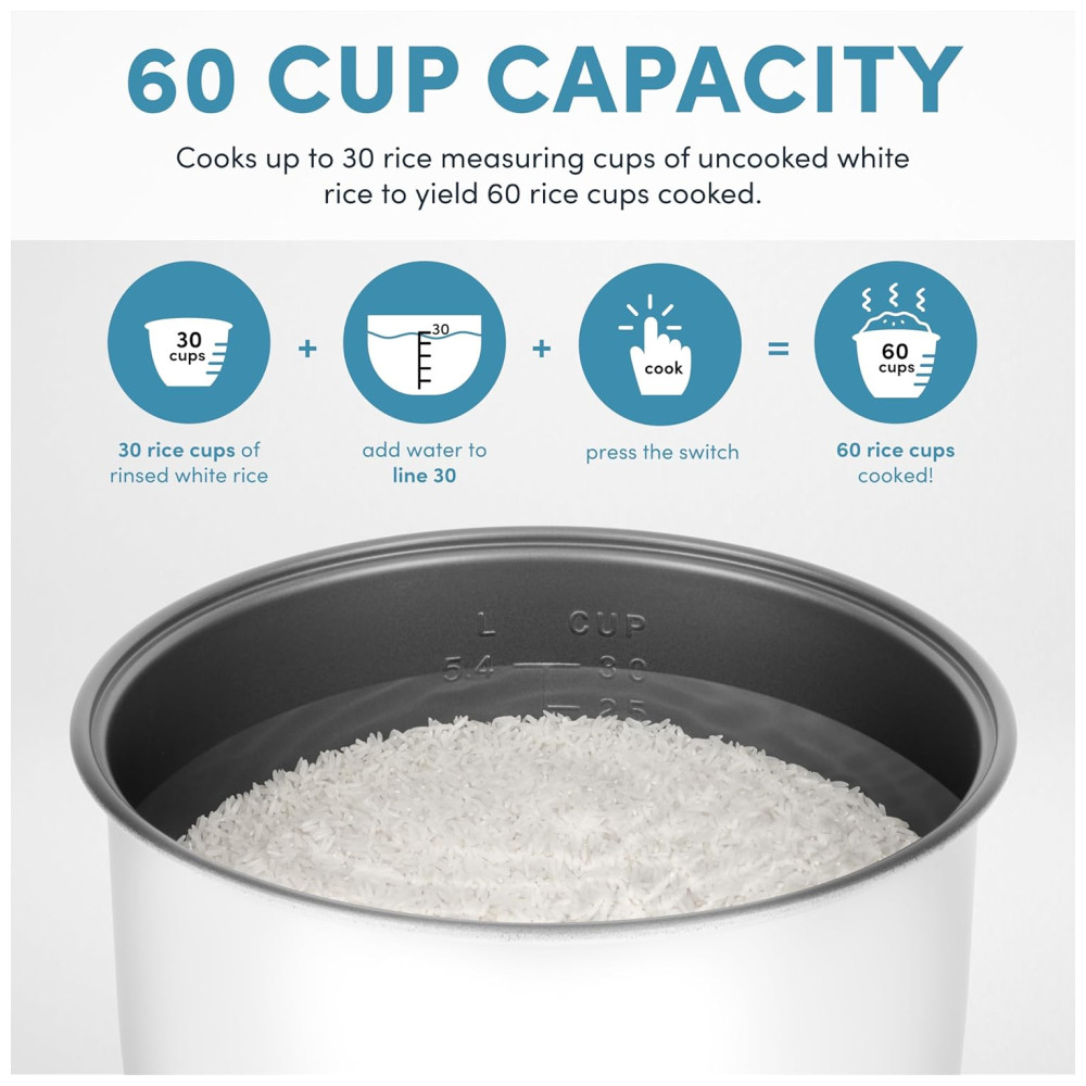 O arroz dobra de volume quando cozido. Esta unidade é uma panela elétrica de arroz com capacidade para 30 xícaras 7.6L não cozidas e 60 xícaras 15L.