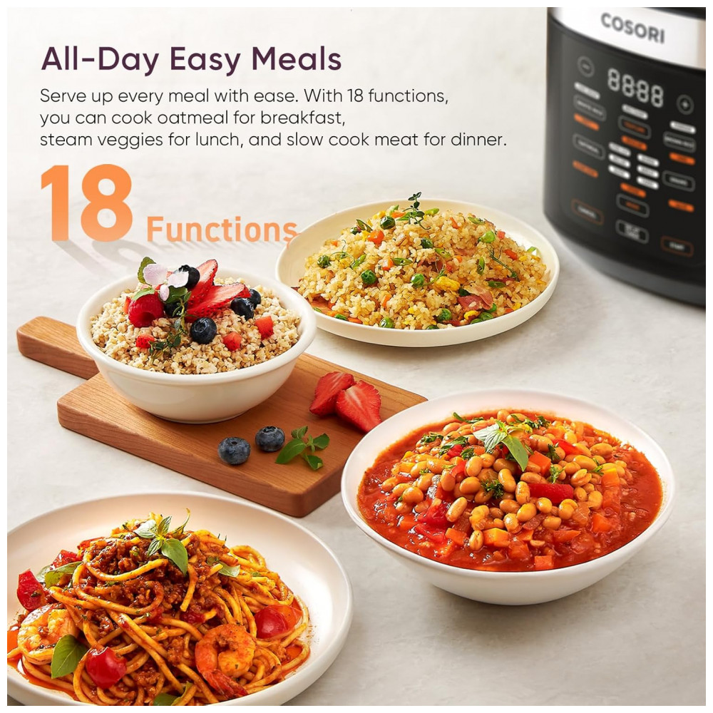Funcionalidade 18 em 1 escolha entre diferentes tipos de arroz e opções de textura, 3 tipos de aveia, 3 tipos de outros grãos e funções como cozimento lento, vapor, refogado, manter aquecido, temporizador de atraso e arroz rápido.