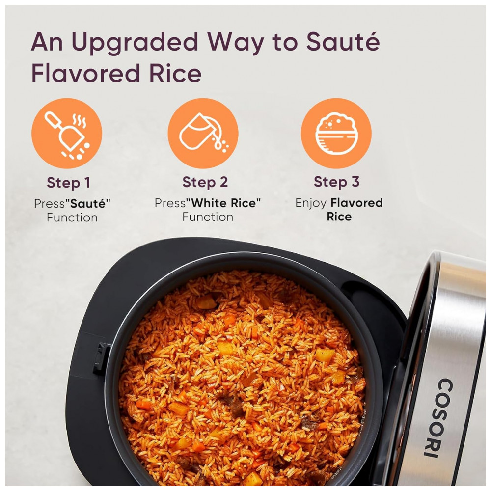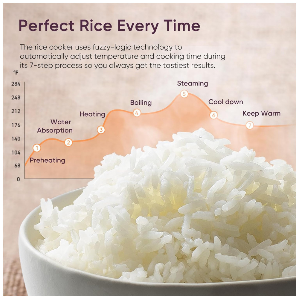 Perfect Rice Every Time Alimentado por tecnologia de lógica difusa, a panela de arroz COSORI controla a temperatura com precisão durante todo o processo de cozimento de arroz em 6 etapas.