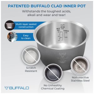 A panela interna de aço inoxidável cozinha alimentos melhores e mais saudáveis, sem revestimento químico, resistente a arranhões, sem reação negativa aos alimentos, construção selada em várias camadas.