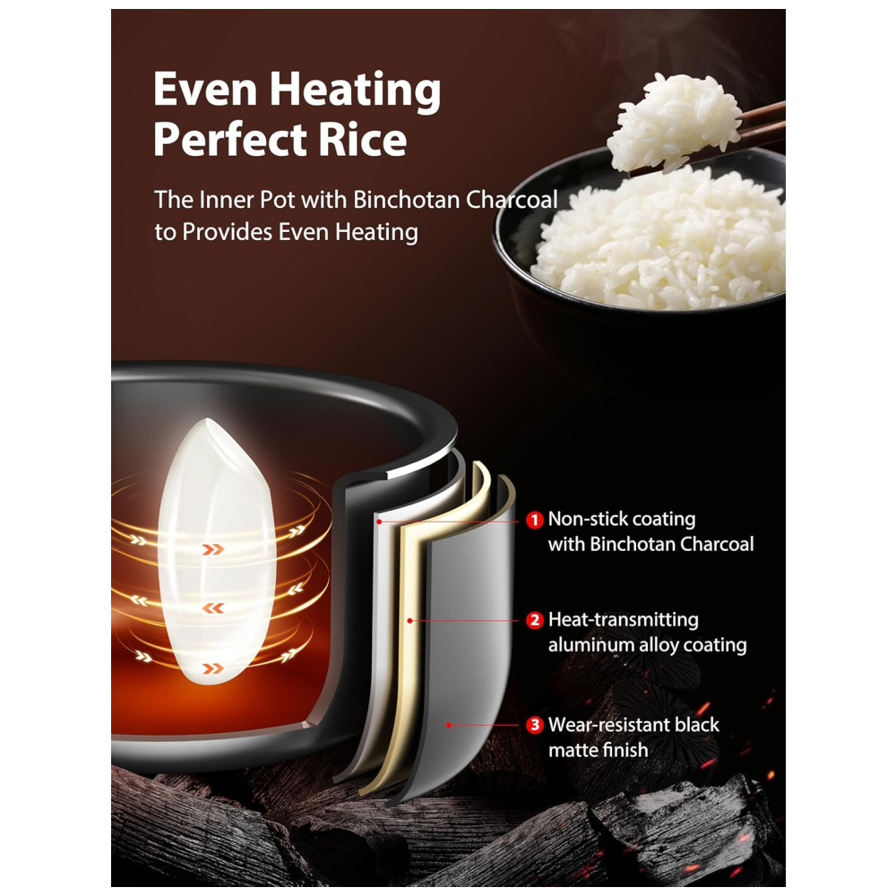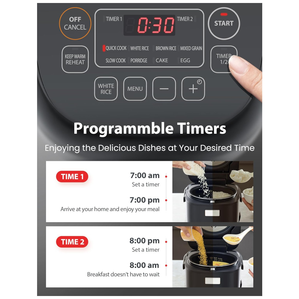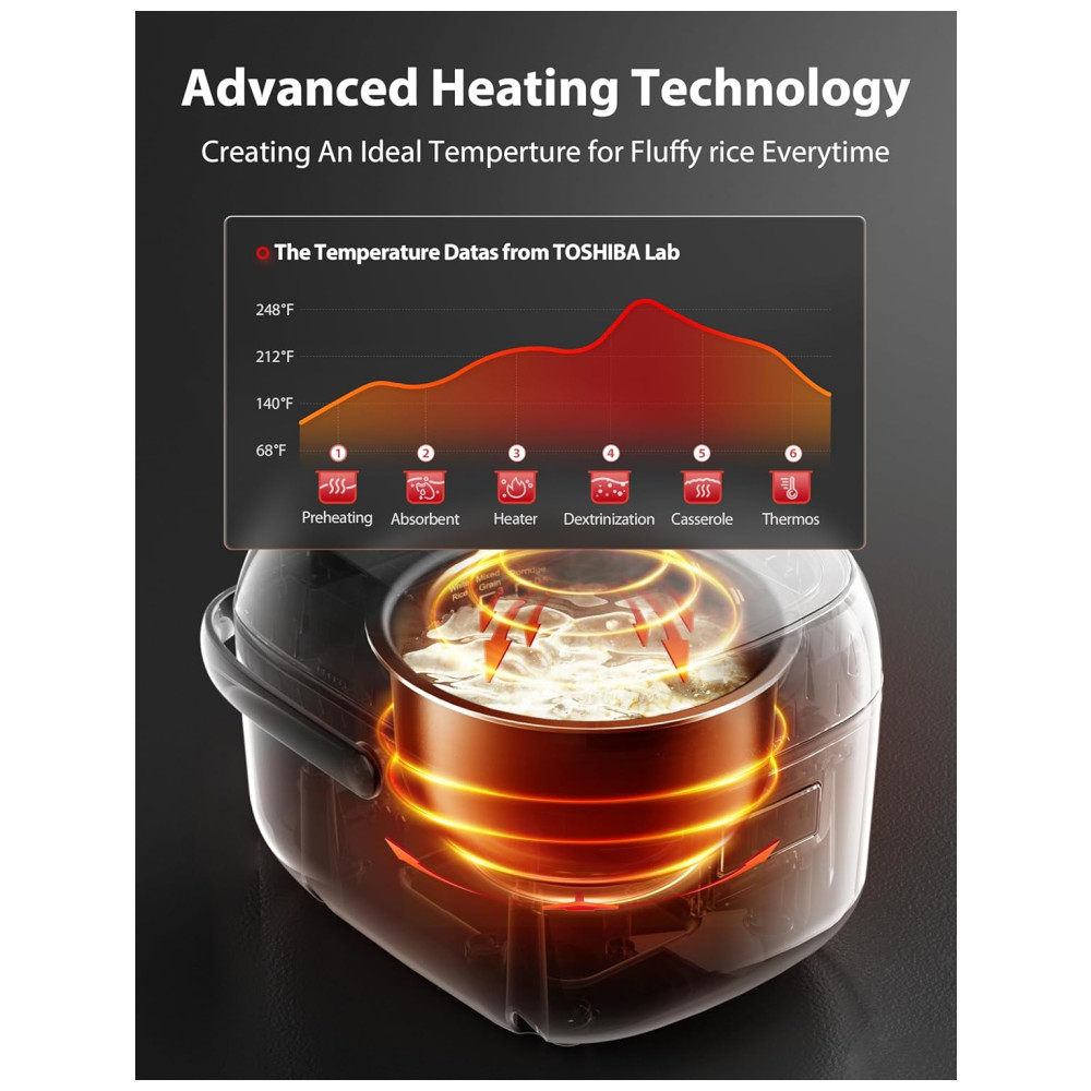 Esta panela de arroz pequena e multifuncional possui uma tela LCD e 8 funções de cozimento programáveis, incluindo arroz branco, cozimento rápido, arroz integral, grãos mistos, lento cozinheiro, mingau, bolo e ovo. É perfeita para famílias ou indivíduos que desejam cozinhar várias porções de arroz de diferentes tipos, como arroz integral, arroz de jasmim, arroz de sushi, arroz branco, arroz basmati e arroz selvagem, bem como grãos como aveia, quinoa, grãos mistos e muito mais. A panela elétrica de arroz TOSHIBA é inteligente e detecta a umidade do arroz, ajustando a temperatura e o tempo de cozimento de acordo, resultando sempre em arroz fofo e perfeitamente cozido. Além disso, a panela interna ultra grossa de 3MM é mais resistente ao desgaste e infundida com material de carbono Binchotan para ajudar a concentrar o calor durante o cozimento, garantindo que o arroz fique mais fofo. O painel de controle intuitivo possui um grande display LCD para programação rápida e sem esforço, e a função Keep Warm Reheat mantém seu arroz quente e delicioso por horas. Os acessórios incluídos são um copo medidor, espátula e concha de sopa.