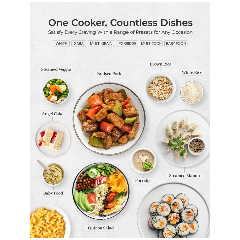 MULTIFUNCIONAL Possui uma função multicozimento versátil que permite preparar de tudo, desde aveia a quinoa, entre 13 outras opções de menu, como arroz branco, arroz GABA, mingau, arroz queimado, arroz pegajoso, comida para bebê, reaquecer e muito mais