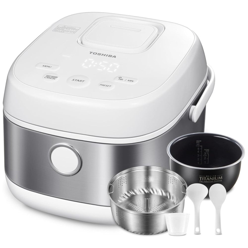 Panela elétrica de arroz TOSHIBA com aquecimento por indução 8 funções timer 24h capacidade 3 litros branco prateado