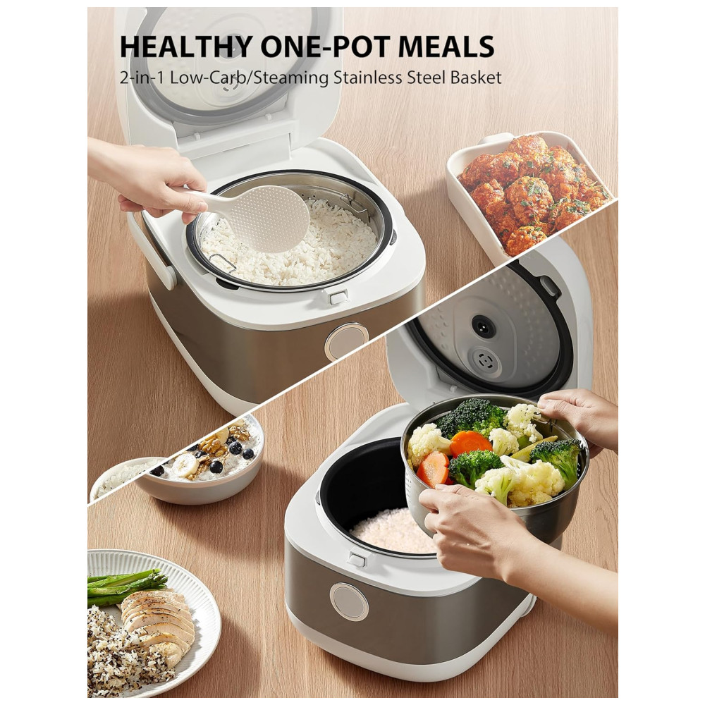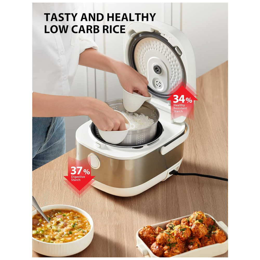 O aparelho dispõe de oito funções programadas, incluindo modos para baixas calorias, arroz rápido, arroz branco, arroz integral, arroz misturado, quinoa, vapor e mingau, ampliando a versatilidade culinária. O modo Low Carb reduz amido digestivo não saudável e aumenta o amido resistente, ideal para dietas específicas.