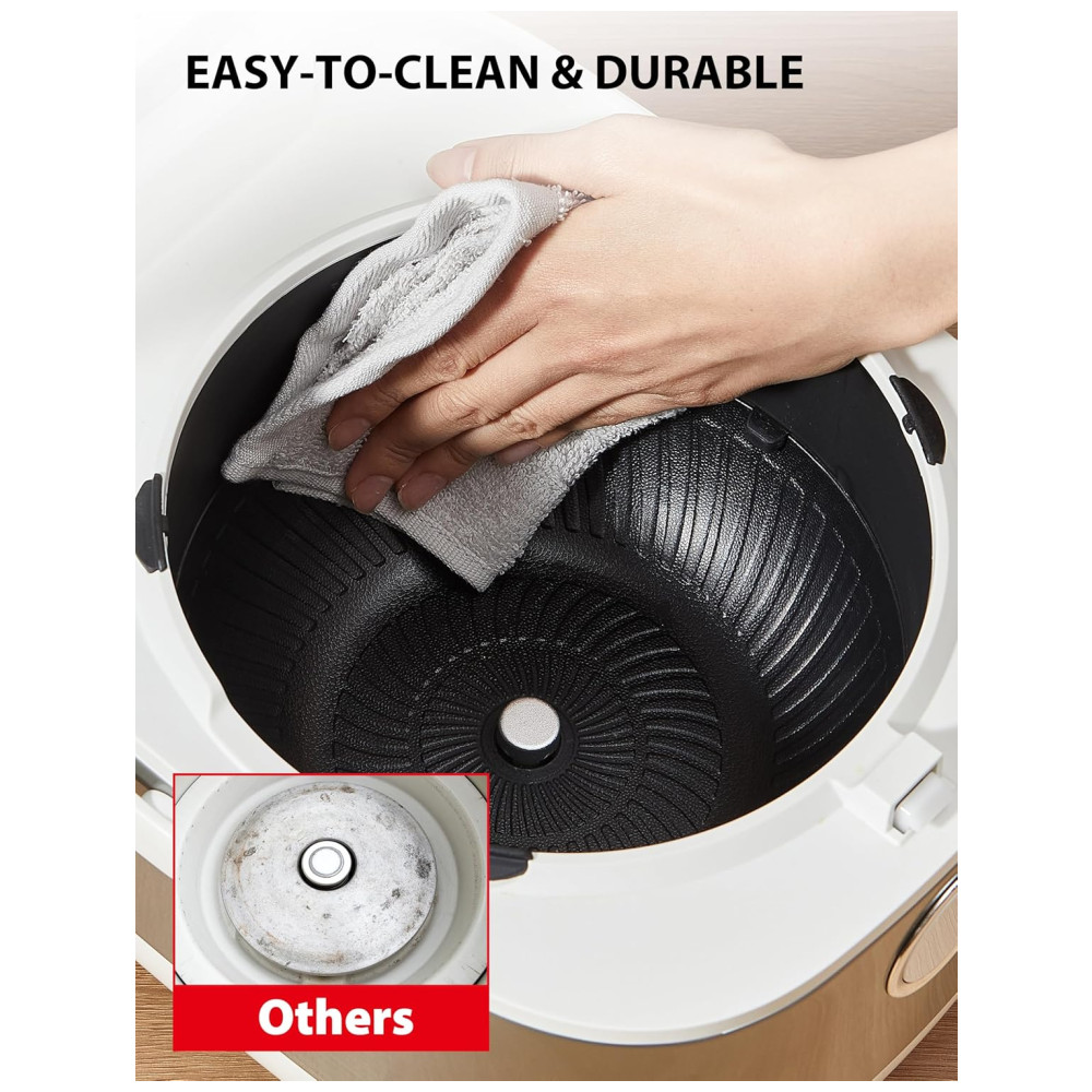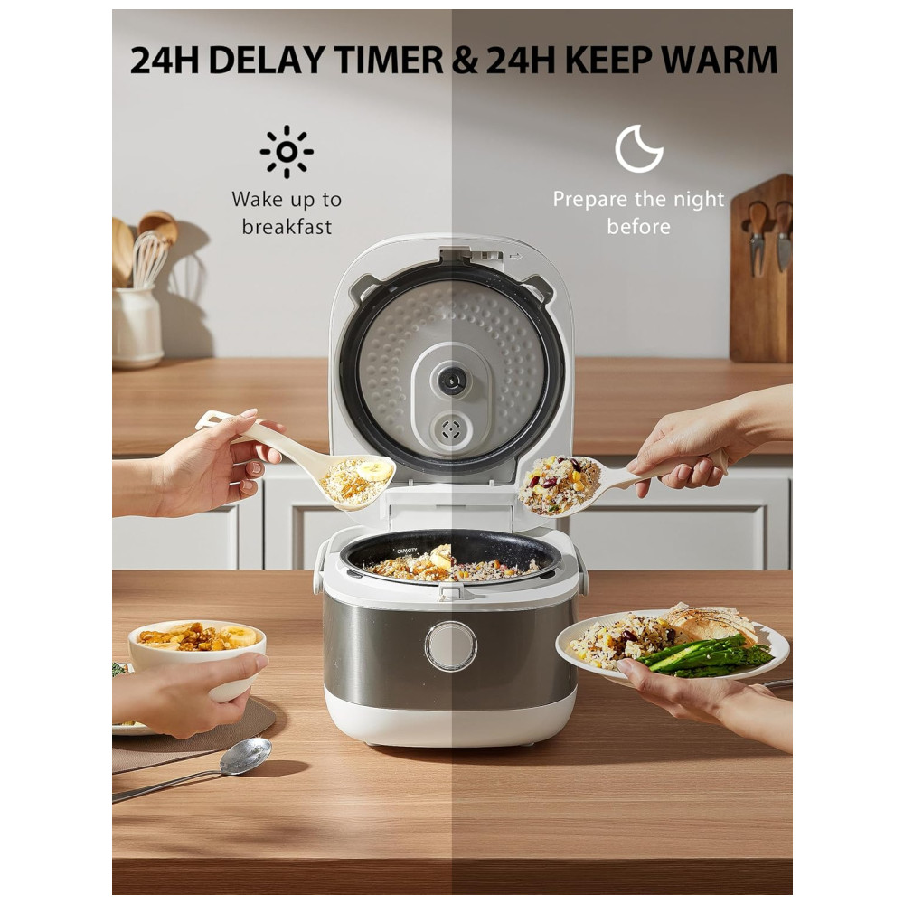 O timer programável de até 24 horas possibilita agendar o início ou término do cozimento, enquanto o modo manter aquecido/re aquecer preserva os alimentos na temperatura ideal após o preparo. O design inclui uma panela interna com revestimento antiaderente fácil de limpar, tampa e válvula de vapor removíveis para manutenção prática.