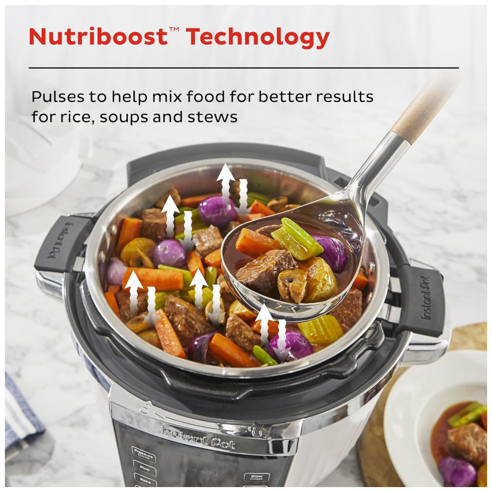 A Instant Pot PRO Max 10 em 1 oferece funções de cozimento sob pressão, lenta, refogar, vapor, sous vide, arroz, iogurte, aquecer, assar e NutriBoost. A integração perfeita com o aplicativo Instant Connect permite selecionar uma receita e seguir as instruções passo a passo, com controle automático do aparelho para resultados perfeitos sempre. Com 20% a mais de potência*, ela garante pré-aquecimento mais rápido e desempenho superior no cozimento. A panela de cozimento em aço inoxidável premium possui um núcleo espesso de alumínio, proporcionando aquecimento mais rápido e uniforme, além de um fundo plano para selar e refogar de forma ideal. A tecnologia NutriBoost pulsa para ajudar a misturar os alimentos durante o preparo, resultando em melhores resultados em arroz, sopas, caldos e risoto.