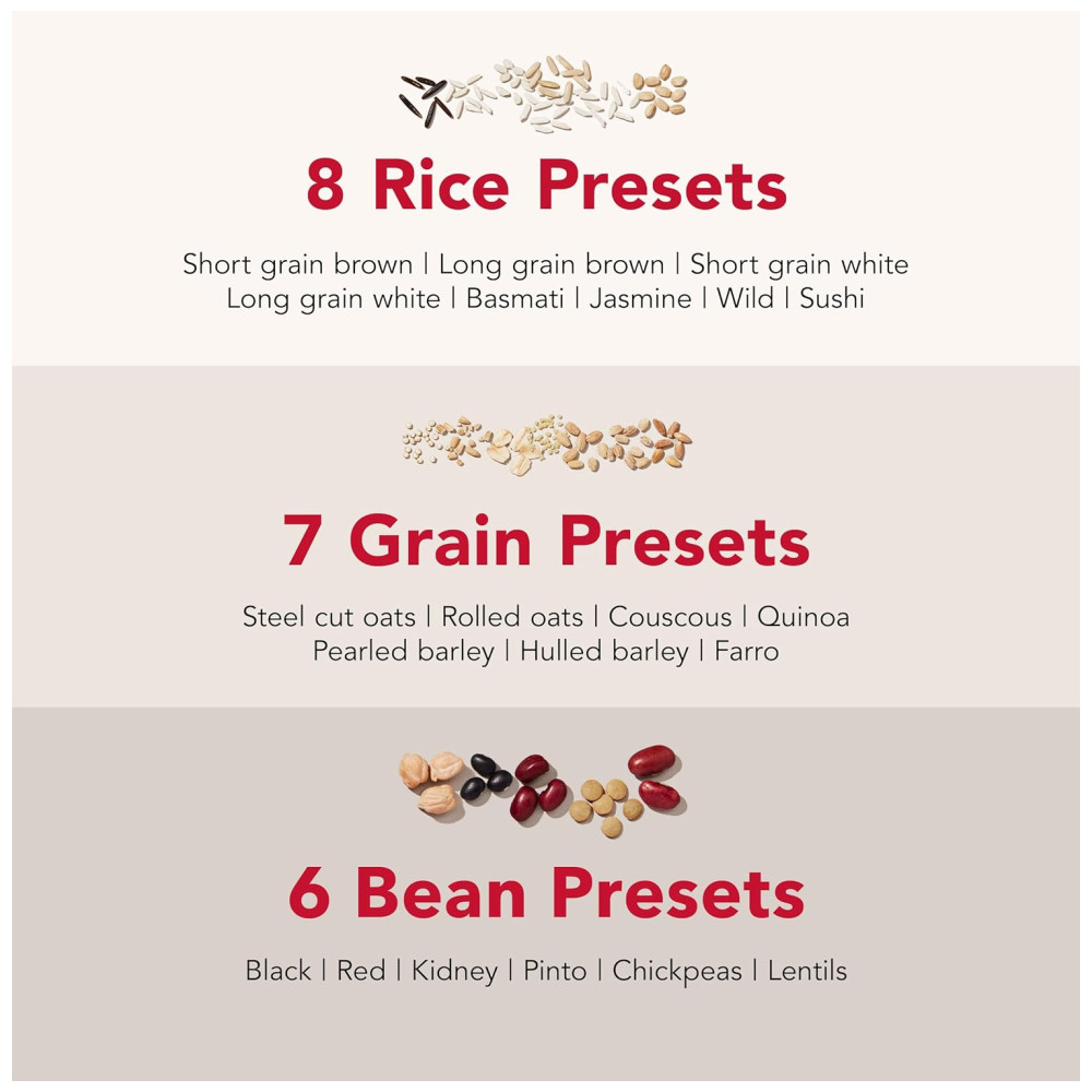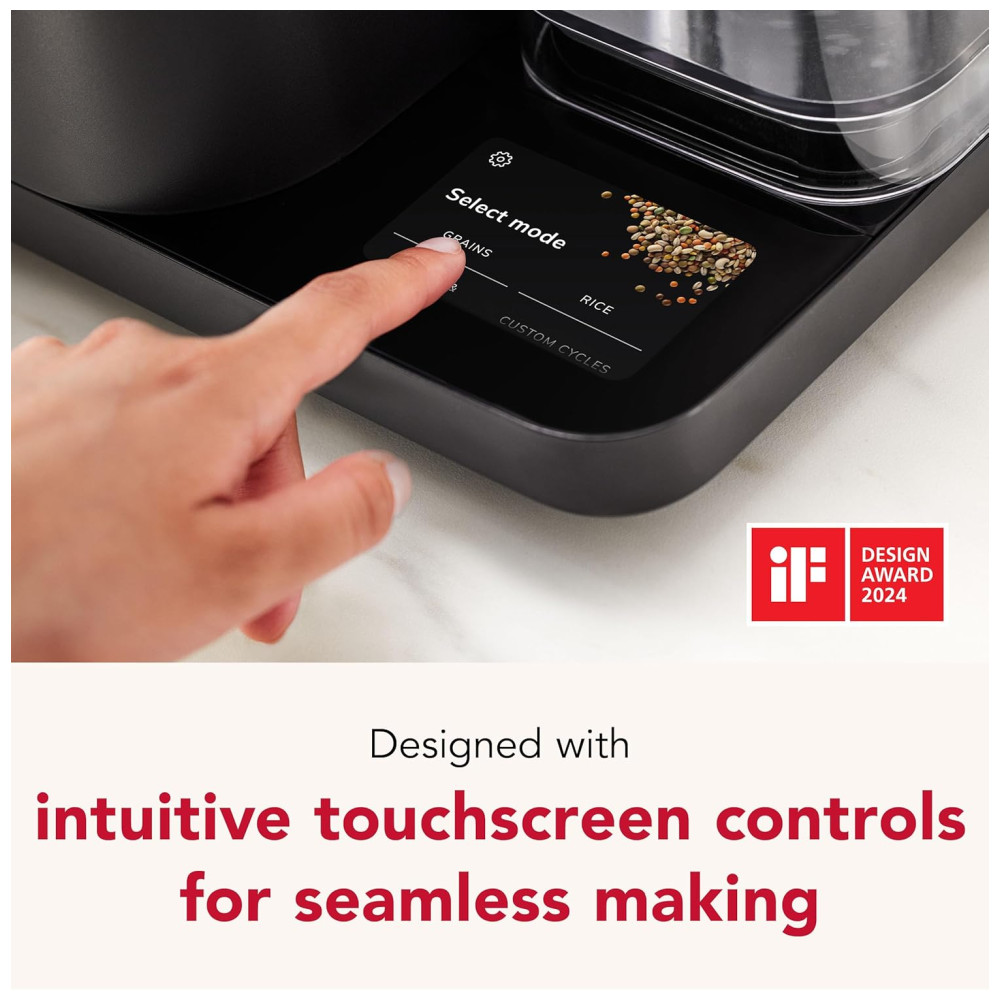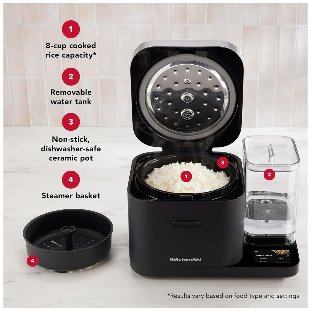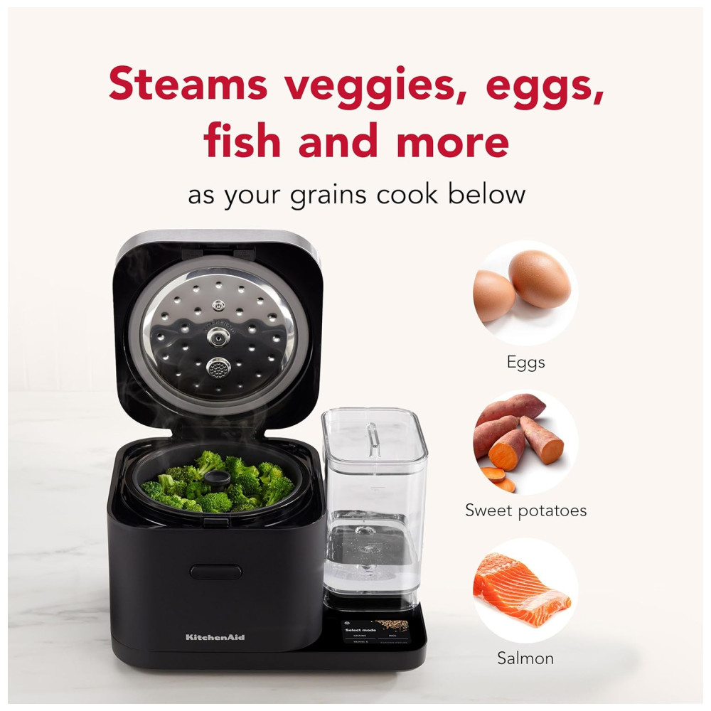 Cozinheiro KitchenAid 8 xícaras com balança integrada que ajusta a proporção ideal de água e grãos automaticamente. 21 opções predefinidas para arroz, feijão, aveia e mais. Inclui cesto de vapor, panela cerâmica antiaderente e tela sensível ao toque. Ideal para preparo de grãos saudáveis e flexível com programação de até 24 horas.