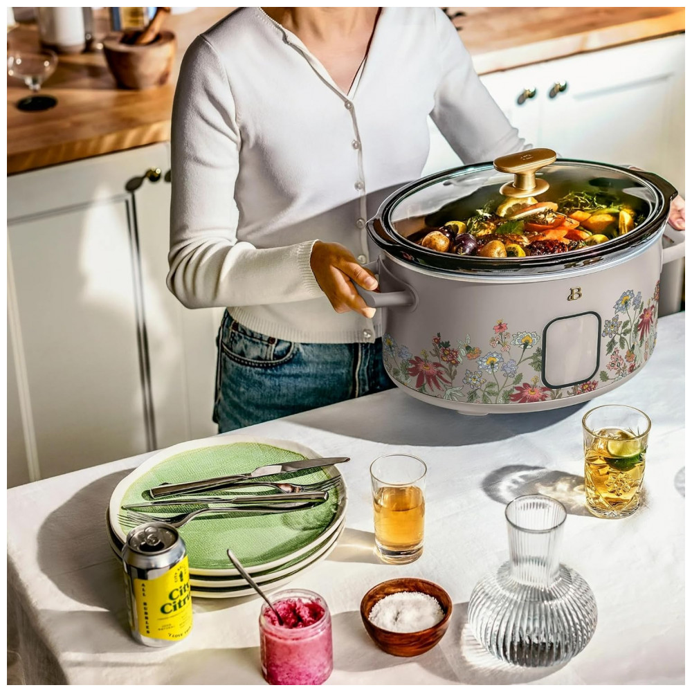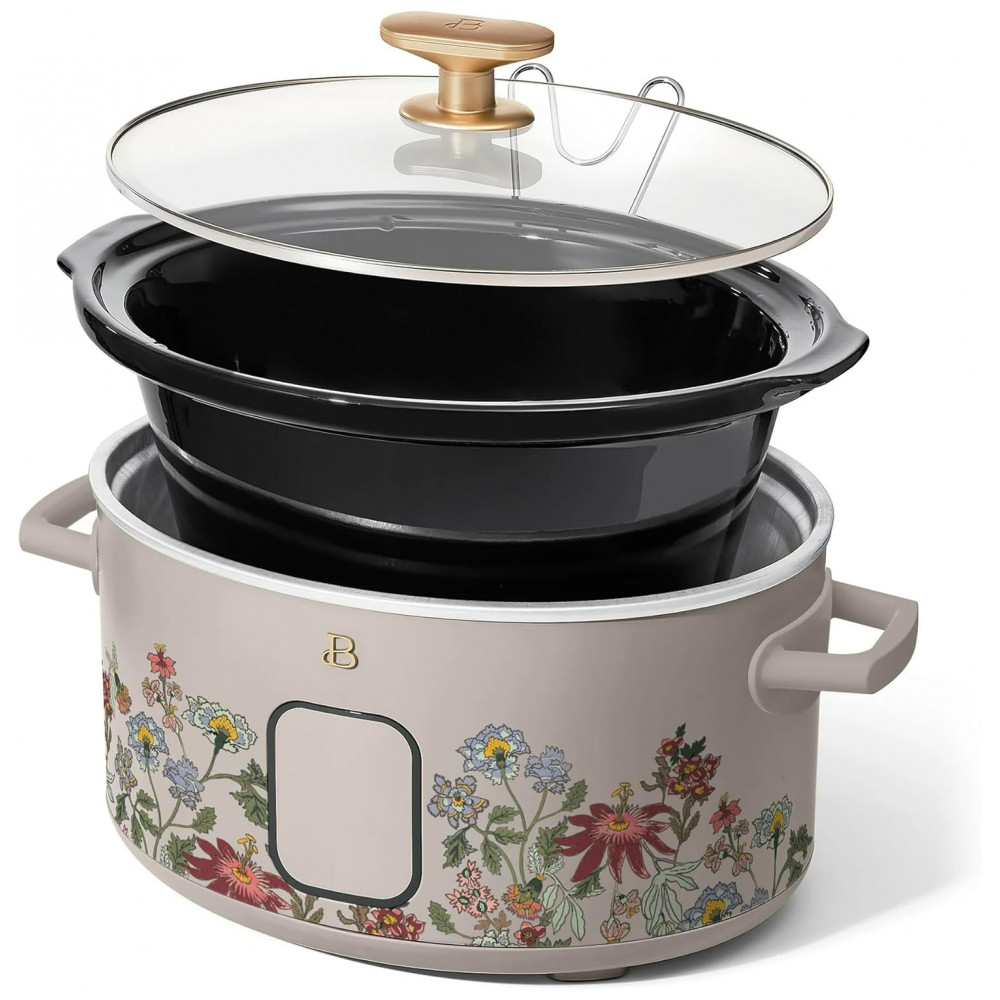 A panela elétrica de cozimento lento Beautiful 6L Wildflower Porcini by Drew Barrymore entrega praticidade para o preparo de receitas volumosas, ideal para até 7 porções. Possui controle digital por toque com display elegante e 5 programas automáticos para carnes, aves, ensopados, sopas e chili. Timer programável permite ajustar tempos de 30 minutos a 24 horas, mudando automaticamente para a função “manter aquecido” ao término do preparo. Cuba removível em cerâmica e tampa em vidro temperado resistente a impactos, ambas laváveis em lava-louças. Alças cool-touch garantem segurança e facilidade no manuseio. Acabamento premium em inox e porcelanato com detalhes dourados.