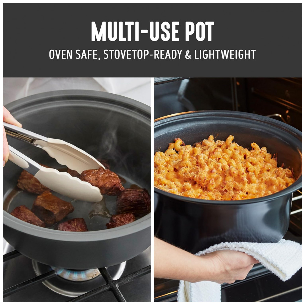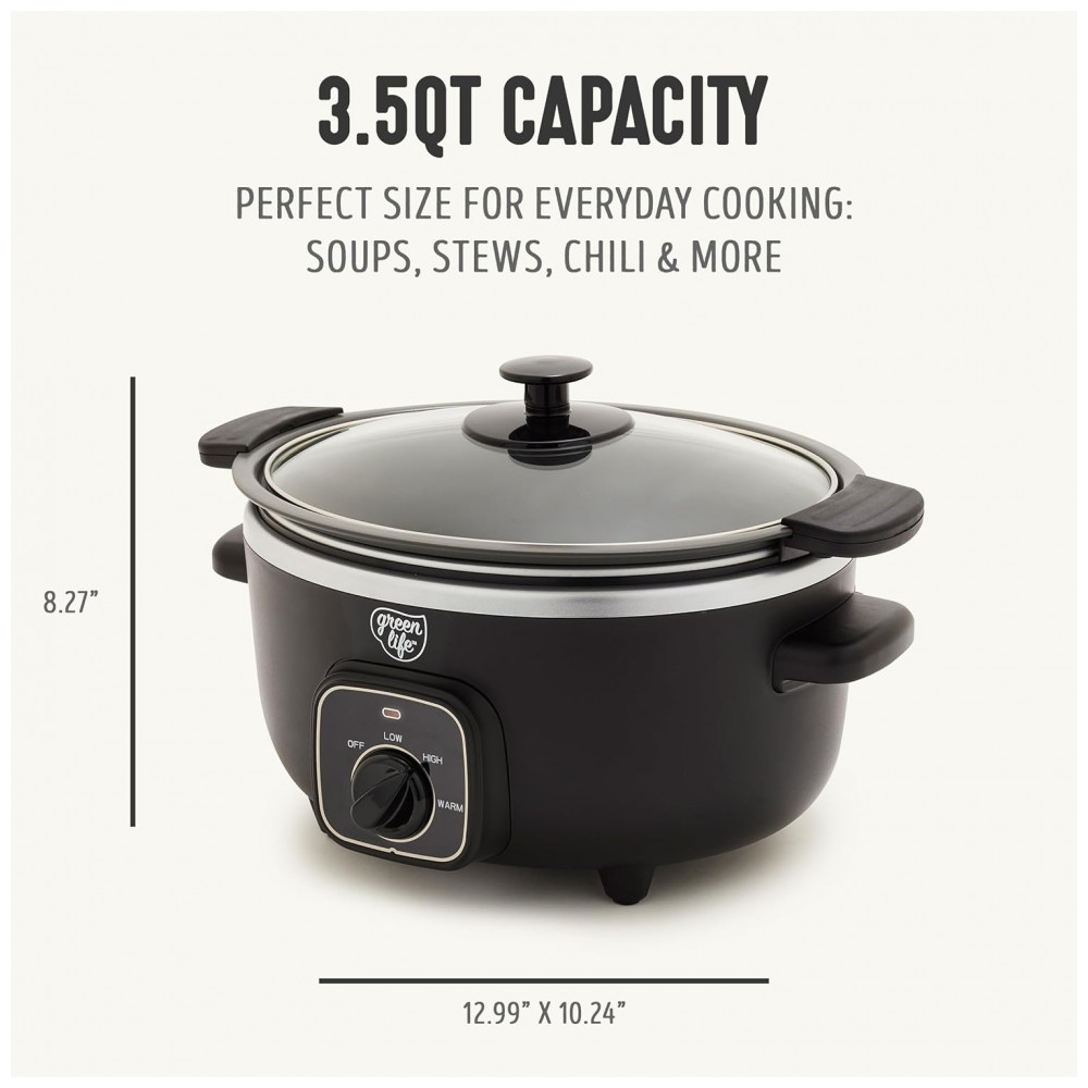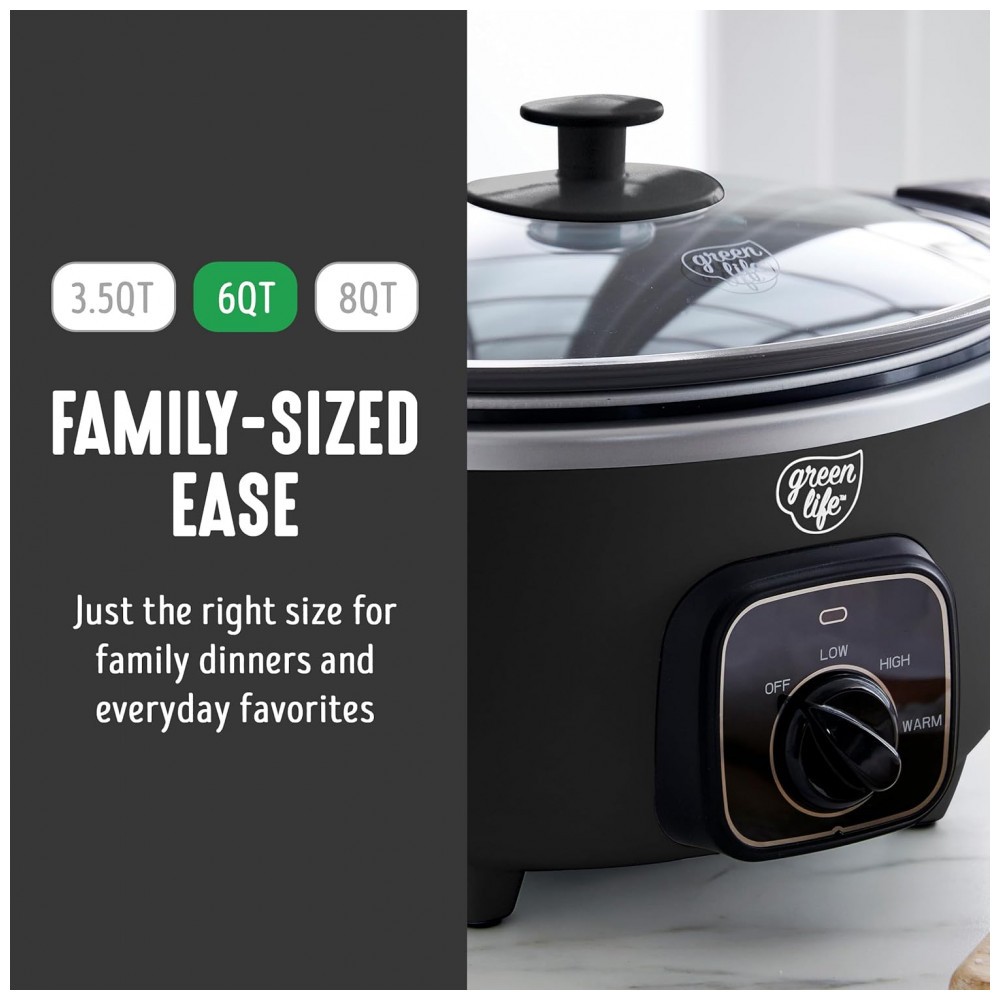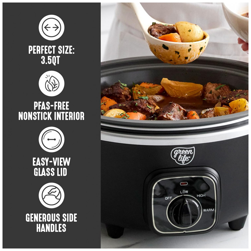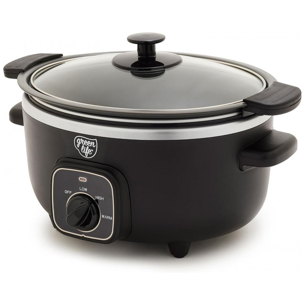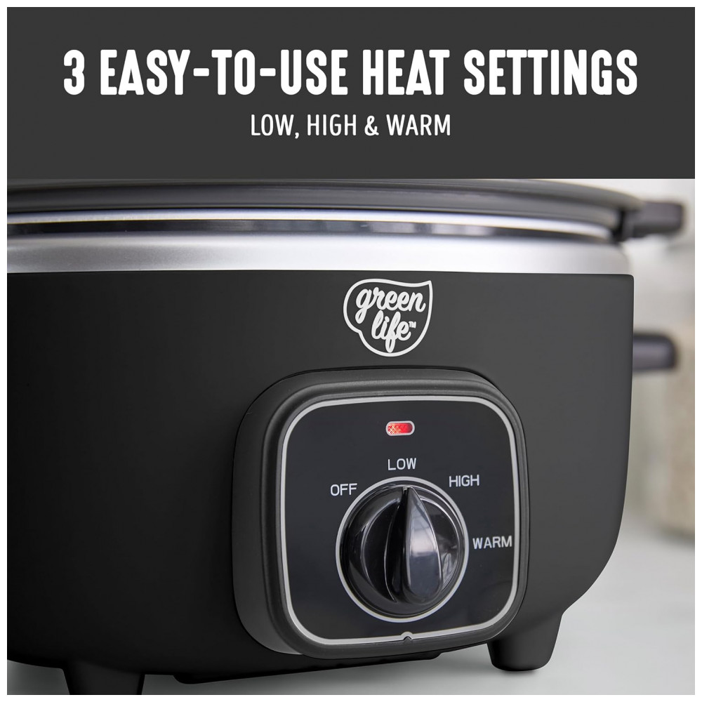 A Panela de Cozimento Lento GreenLife torna simples preparar refeições deliciosas sem preocupações. Sua panela removível de 3,31 litros é perfeita para sopas, ensopados, chili e muito mais, enquanto o design compacto economiza espaço no balcão e nos armários. A panela removível pode ser usada no fogão e no forno até 204°C, permitindo começar com uma selagem rápida para construir sabor, e depois cozinhar lentamente até a perfeição. O revestimento saudável de cerâmica antiaderente da GreenLife facilita a limpeza e é livre de PFAS para refeições mais saudáveis, do café da manhã até a noite. O seletor de controle simples apresenta configurações de Baixo, Alto e Manter Aquecido para combinar com sua refeição e sua agenda, enquanto a tampa de vidro transparente permite monitorar sua comida sem perder calor. Quando sua criação estiver pronta, gire o seletor para Manter Aquecido para manter aquele sabor fresco e servir na hora certa. Além disso, a panela removível e a tampa são ambas seguras para lava-louças para uma limpeza fácil. CAPACIDADE PERFEITA DE 3.5 LITROS projetada para cozinhar no dia a dia sopas, ensopados, chili, assados e muito mais. Além disso, o tamanho conveniente economiza espaço sem comprometer o sabor. PANELA PRONTA PARA O FOGÃO A panela leve pode ser removida para uso no fogão e forno até 204°C, permitindo começar com uma selagem e depois cozinhar lentamente para obter mais sabor. REVESTIMENTO DE CERÂMICA ANTIADERENTE SAUDÁVEL O revestimento saudável e fácil de limpar de cerâmica antiaderente da GreenLife oferece liberações sem esforço com uma limpeza rápida. LIVRE DE TOXINAS O revestimento de cerâmica antiaderente livre de PFAS da GreenLife proporciona refeições sem preocupações. SELETOR FÁCIL DE USAR 3 Configurações de Calor Baixo, Alto, Manter Aquecido ENCONTRE A TEMPERATURA CERTA Se você precisa cozinhar em fogo baixo e lento ou deseja acelerar as coisas, as 3 configurações de temperatura tornarão suas refeições simples. TAMPA DE VIDRO TRANSPARENTE Uma tampa de vidro transparente permite que você acompanhe sua criação. FÁCIL DE LIMPAR Limpe a tampa e a panela com um pano e/ou coloque na lava-louças para sujeiras difíceis. FUNÇÃO DE MANTER AQUECIDO Gire o seletor para Manter Aquecido para manter sua refeição quente e pronta para servir sem ressecar. ALÇAS LATERAIS DURÁVEIS As alças frias ao toque proporcionam uma aderência segura e firme para transferências sem problemas.