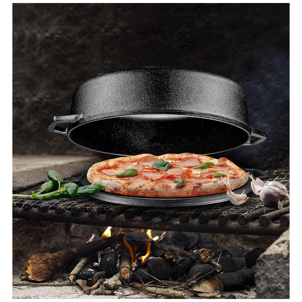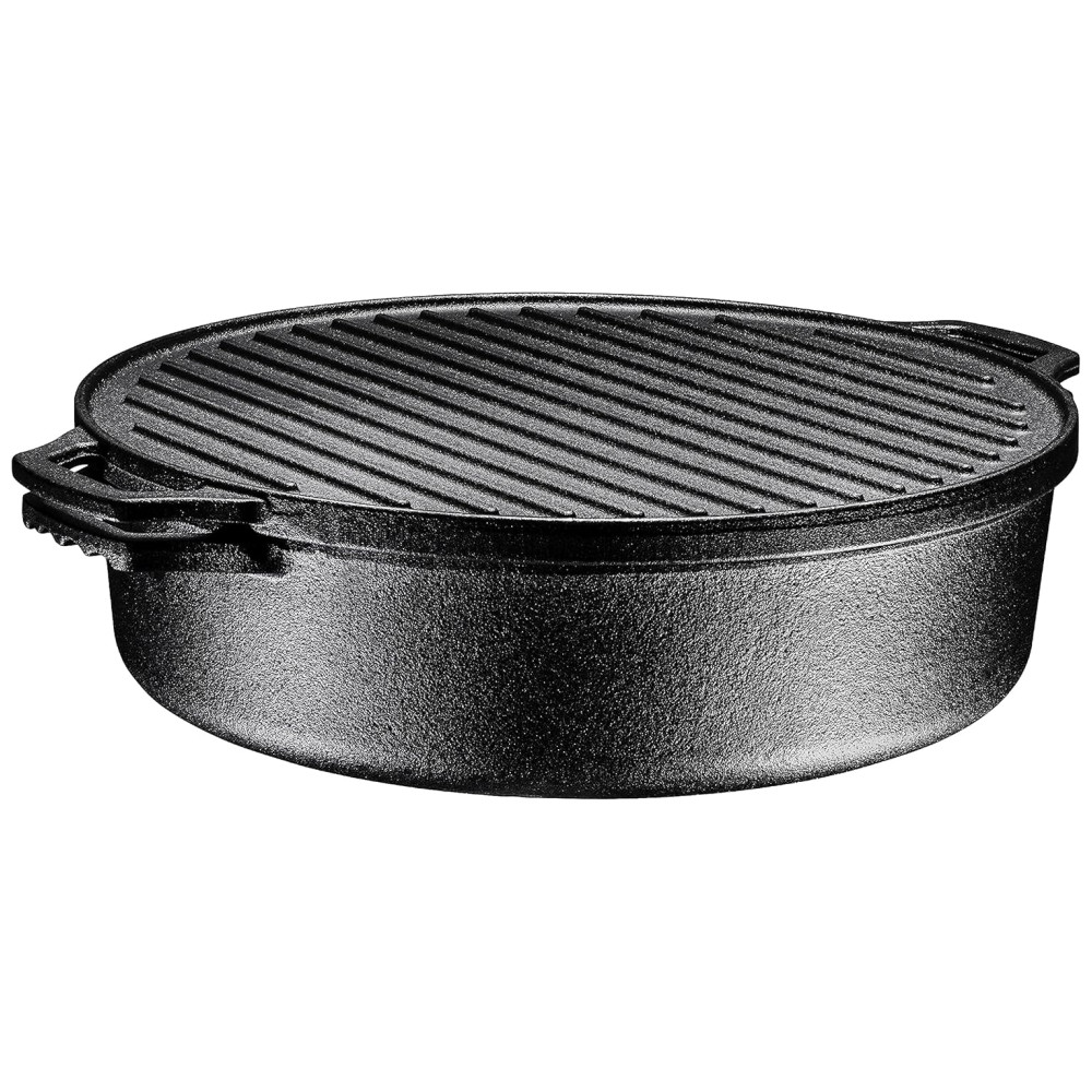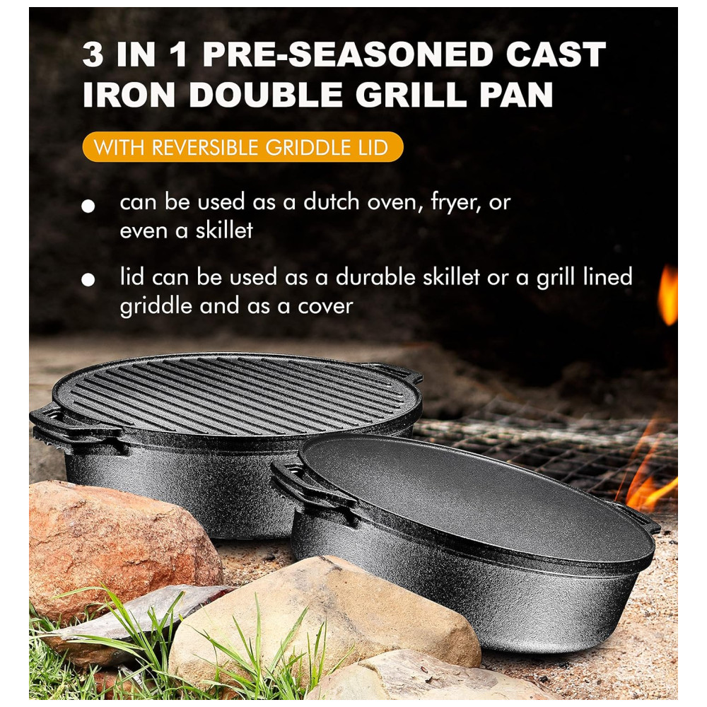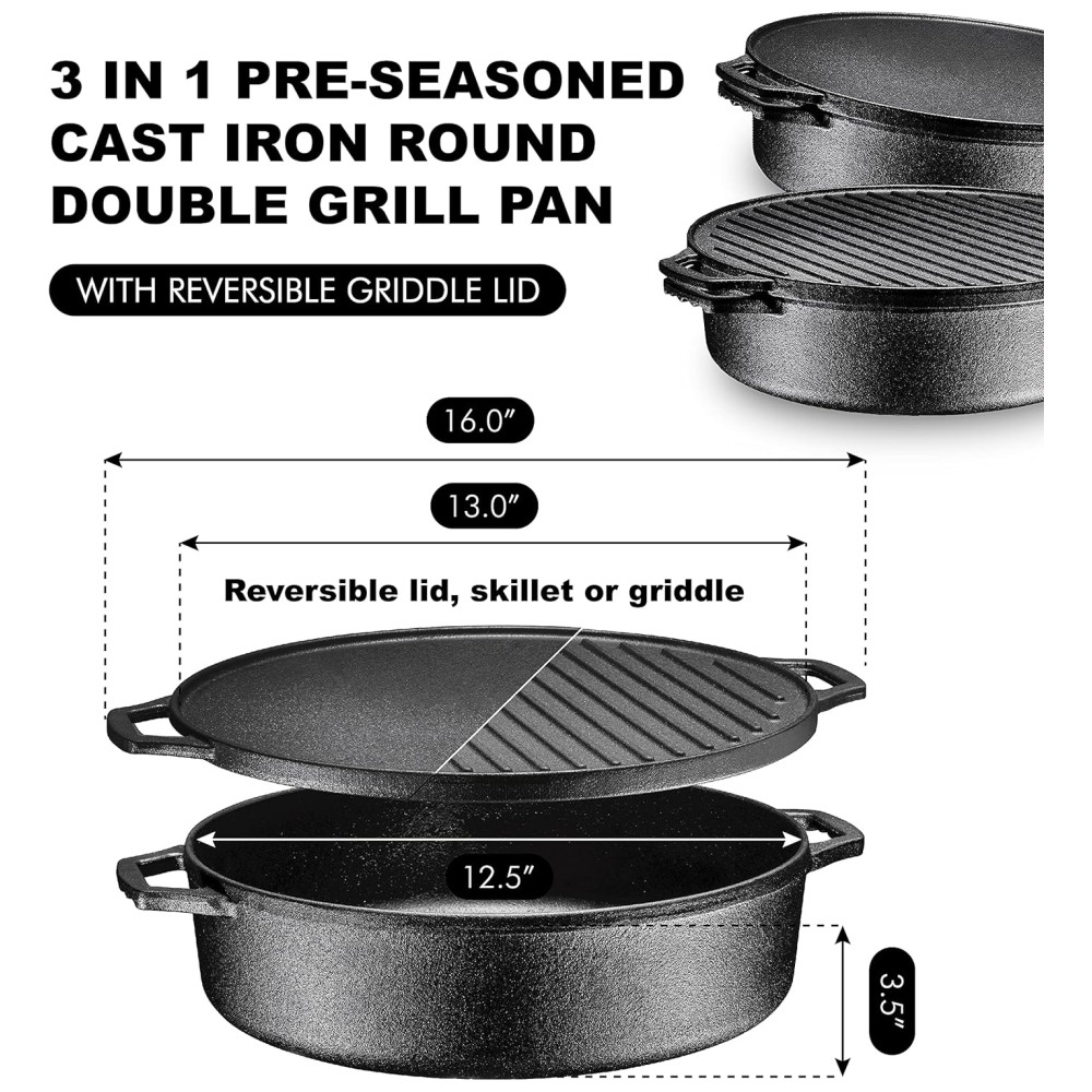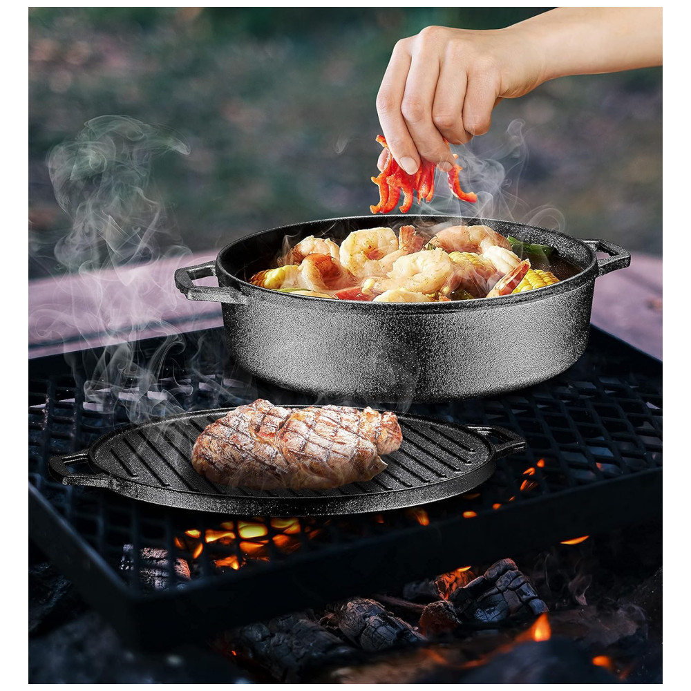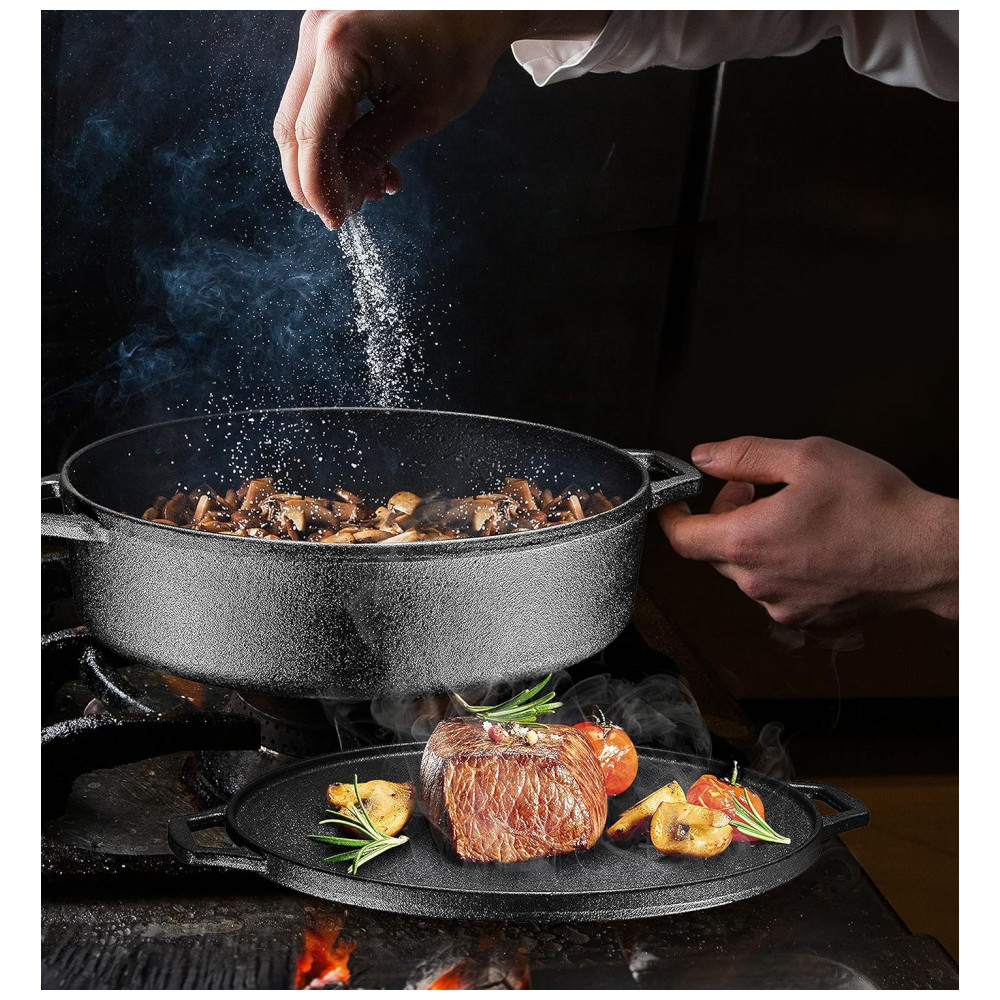 TAMPA DE MÚLTIPLAS COZINHAS VERSÁTIL REVERSÍVEL O que poderia ser melhor do que uma grelha reversível, frigideira e um forno holandês, tudo em uma panela A tampa reversível e a assadeira redonda multi fogão 6.8 Quart podem ser utilizadas de diferentes maneiras. A frigideira pré temperada de ferro fundido com tampa pode ser usada como forno holandês, fritadeira, grelha e frigideira. As possibilidades são infinitas