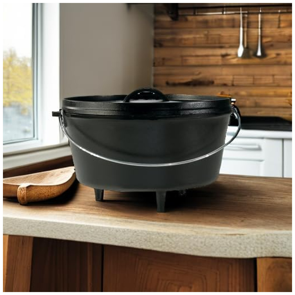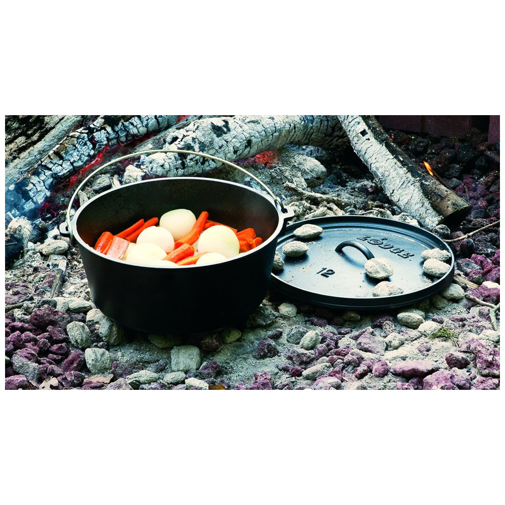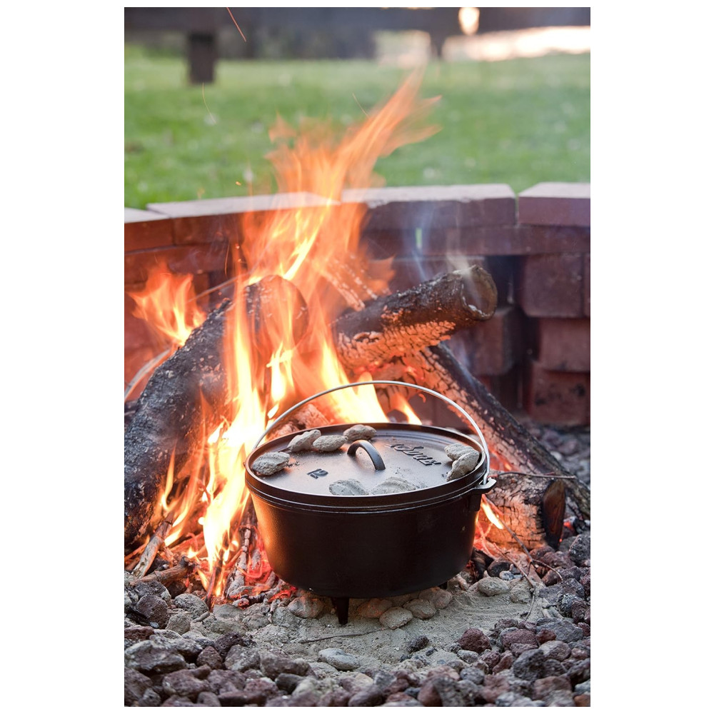8 QT. FORNO HOLANDÊS DO ACAMPAMENTO PROFUNDO. O fogão de acampamento portátil Lodge é a panela que faz tudo. A tampa flangeada contém carvão quente e se inverte para usar como chapa. As pernas integradas permitem que o forno assente perfeitamente sobre a fogueira.