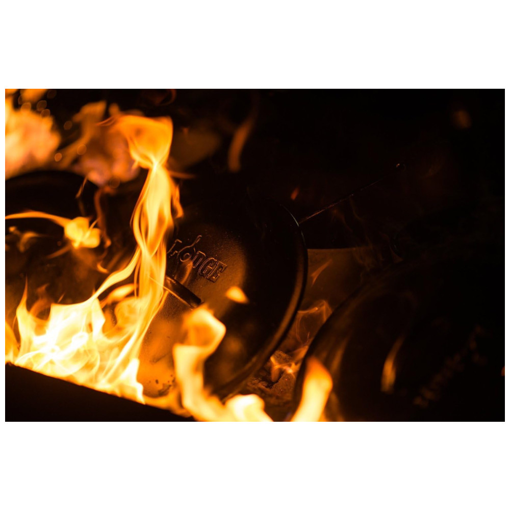 COZINHAR NO ACAMPAMENTO 101. Lodge sabe que cozinhar é mais do que apenas comida é sobre as memórias. Esteja você assando um frango no forno ou cozinhando chili na fogueira, o Lodge ajuda você com o livro de receitas Camp Dutch Oven Cooking 101 incluso