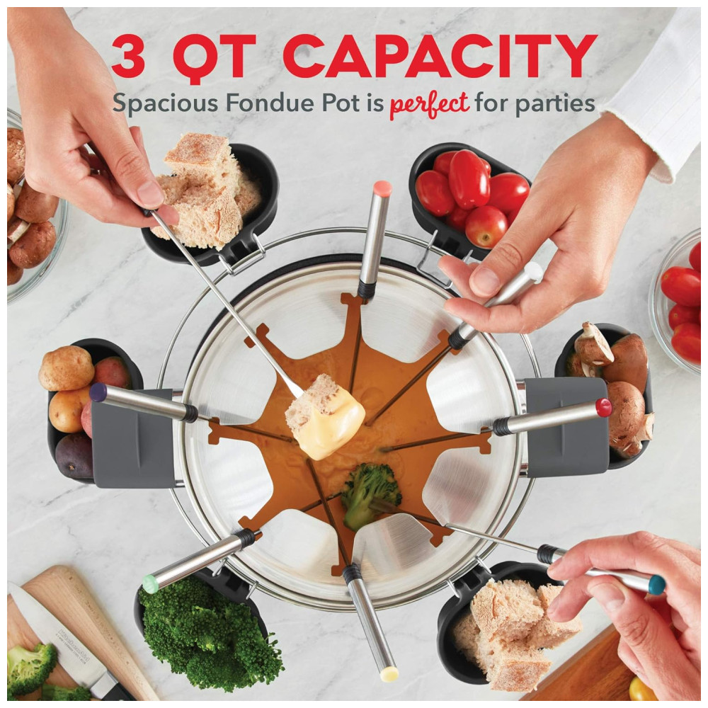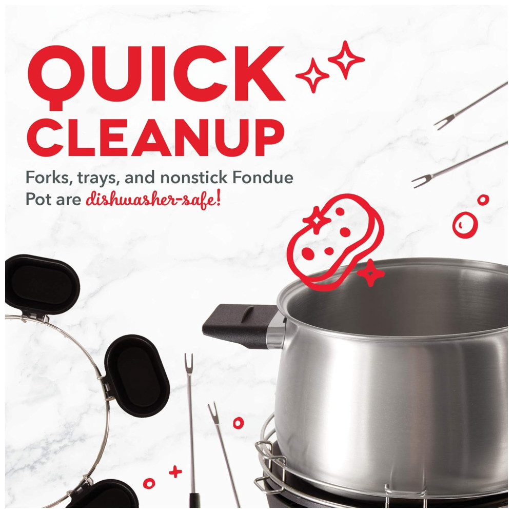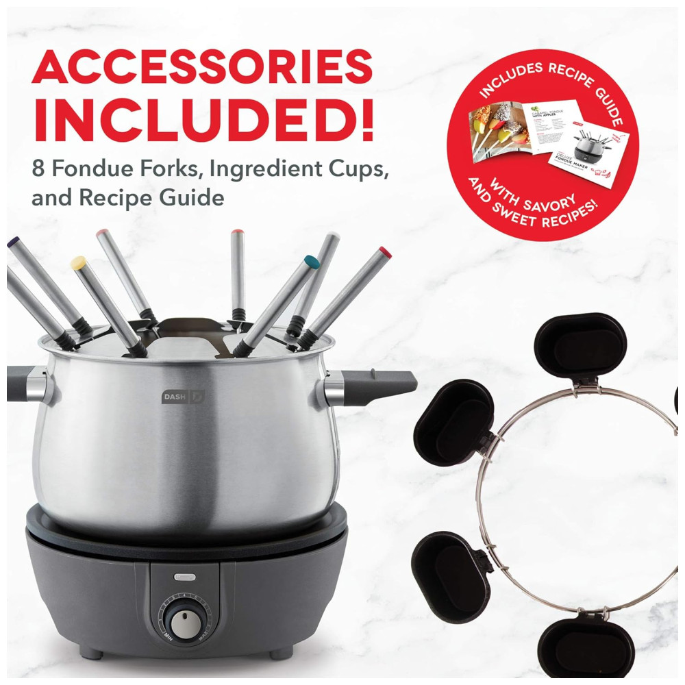 INCLUI Dash Deluxe Fondue Maker, 8 Fondue Fondue Forks com código de cores, Garfo Rack para reduzir gotejamentos, Anel de Metal e Fondue Copos Guia de Receitas de Bom Gosto.