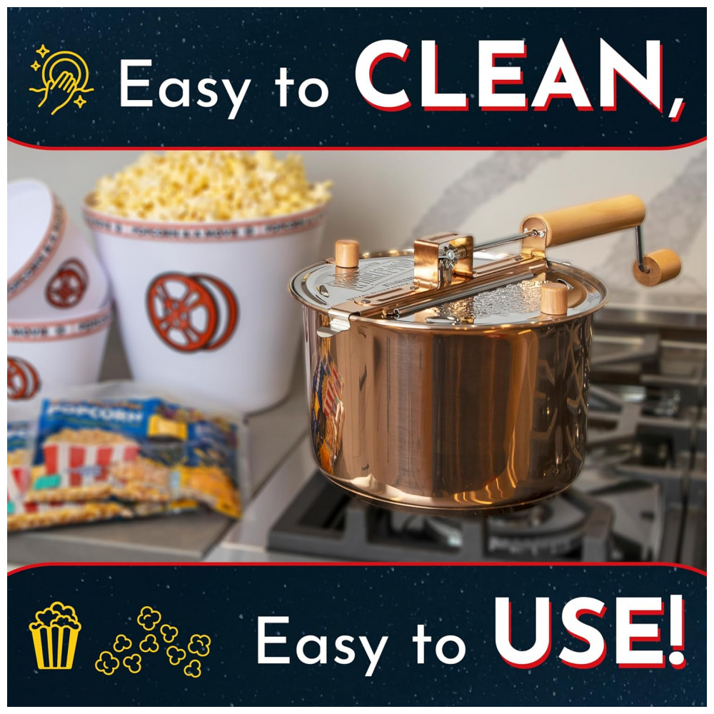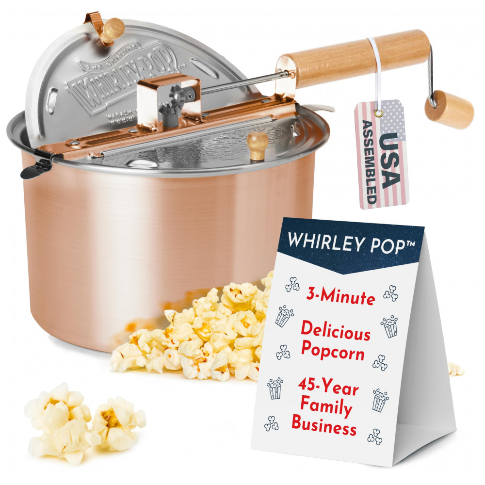 A Pipoca Estufa Whirley Pop Original da Wabash Valley Farms em acabamento cobre processa até 6 quarts (cerca de 5,7 litros) de pipoca em fogão, com rotação manual por manivela e sistema de agitação patenteado para distribuição uniforme dos grãos. Projetada para uso doméstico em fogões elétricos, a gás ou indução, completa lotes em 3 minutos sob calor direto.