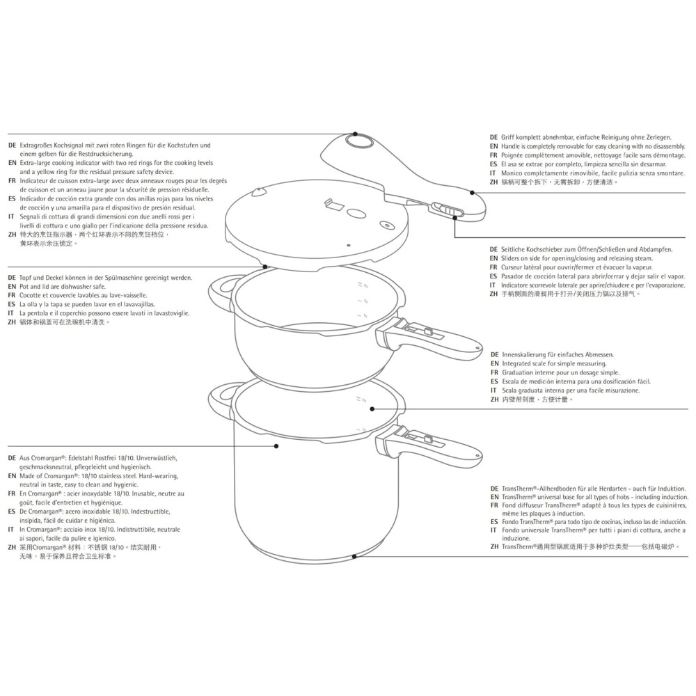 A escala interna facilita a medição de quantidades. Indicador de cozimento codificado por cores. 2 níveis de cozedura fixos ajustáveis 110 C , 119 C. Operação simples através do regulador do estágio de cozimento com uma só mão. Alça da tampa removível para limpeza rápida e fácil. Sistema de válvula livre de manutenção.