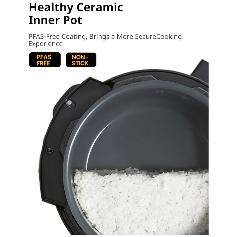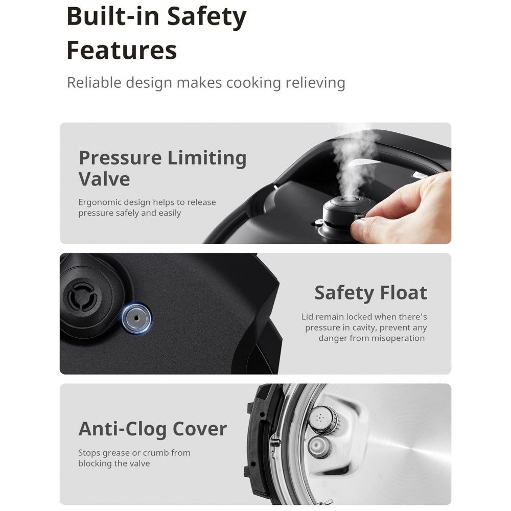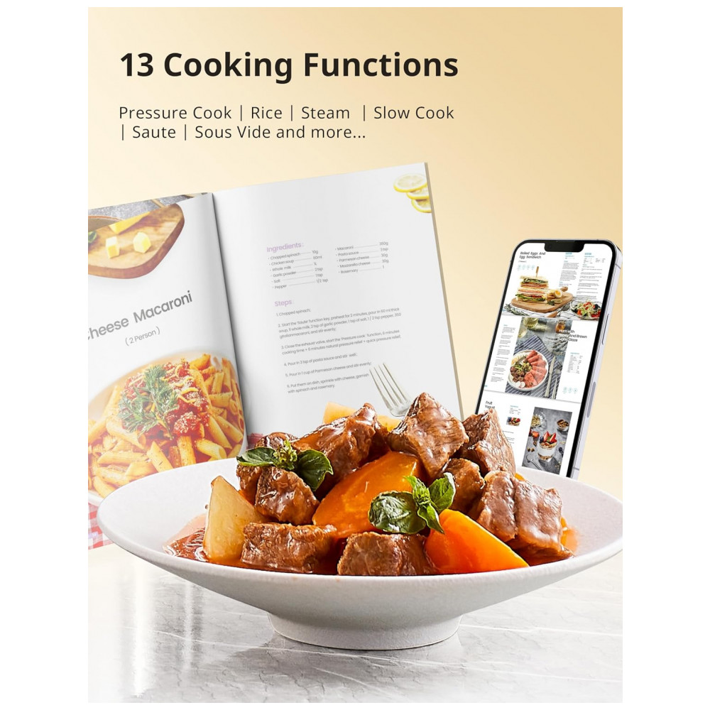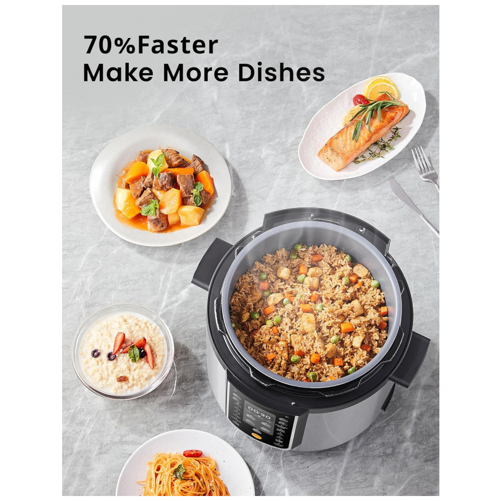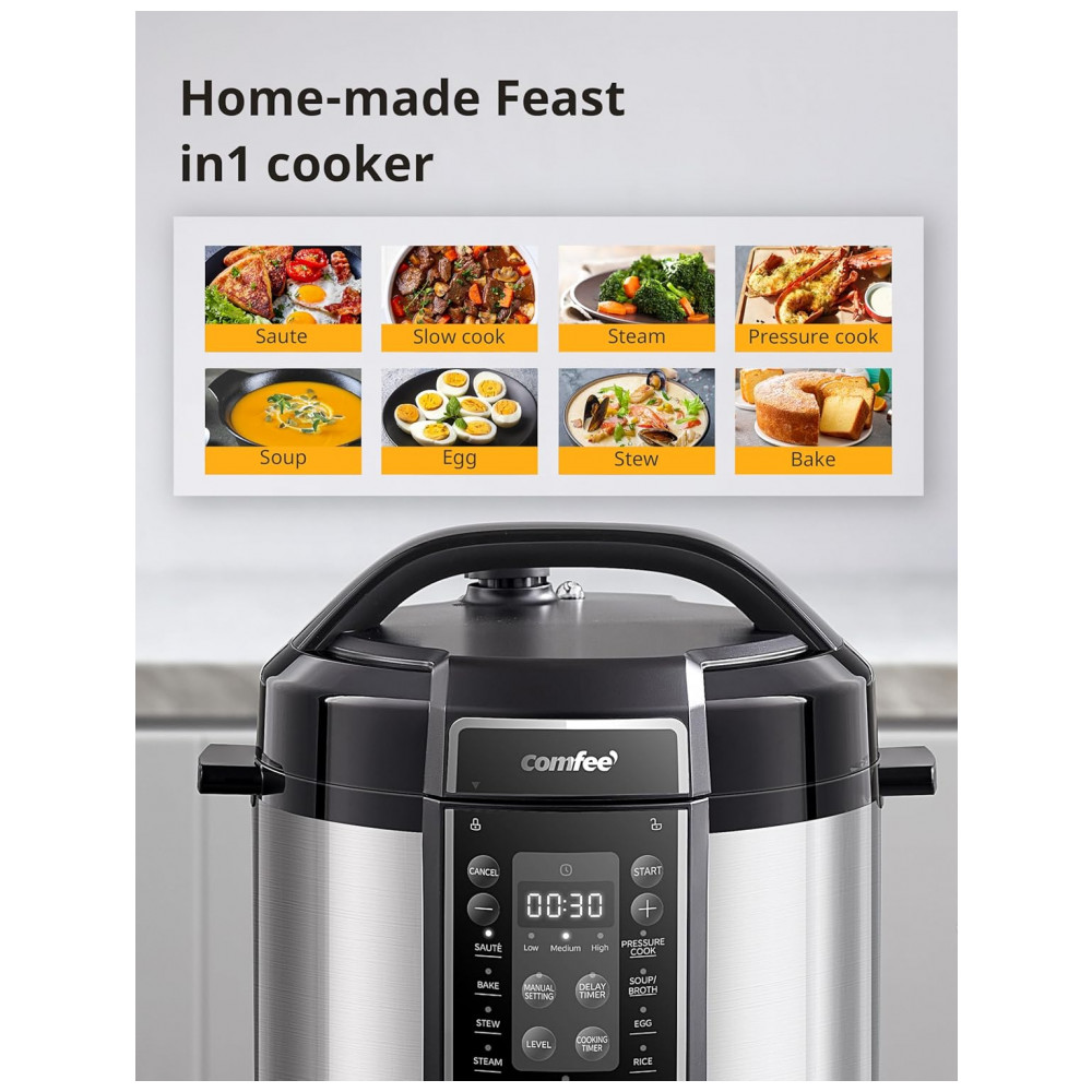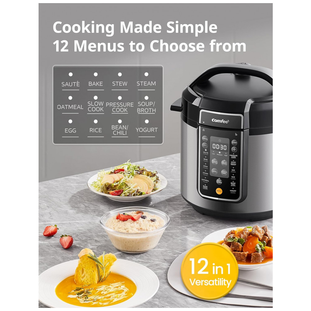 A Panela de Pressão COMFEE de 6 litros oferece 13 funções programáveis para atender a todas as suas necessidades culinárias. Cozinhe pratos gourmet como carne, caldo, feijão, aveia, entre outros, de forma simples e rápida. Cozinhe refeições saudáveis com sua panela revestida de cerâmica, livre de substâncias tóxicas. O revestimento antiaderente facilita a limpeza e garante durabilidade. Possui diversas medidas de segurança, como trava na tampa, válvula limitadora de pressão, controle automático de pressão e temperatura, proteção contra superaquecimento, entre outros. A panela interna saudável e antiaderente é fácil de usar e limpar, podendo ser levada à lava-louças. Ideal para cozinhar até 6 pessoas, vem com diversos acessórios úteis: colher, concha, copo de medição, suporte de vapor, entre outros.
