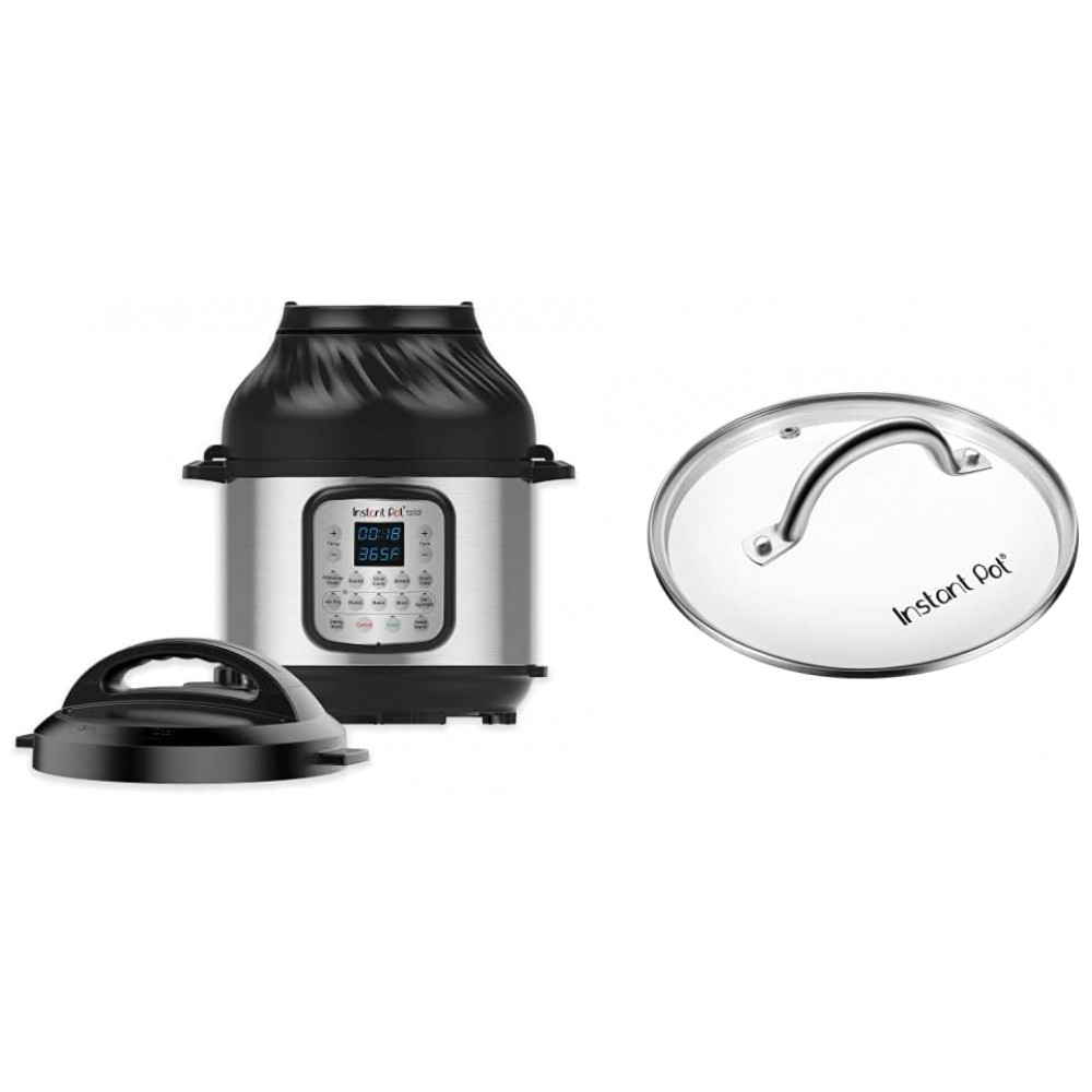 Acompanha uma tampa de vidro temperado Instant Pot com válvula de vapor, borda de aço inoxidável e alça resistente.
