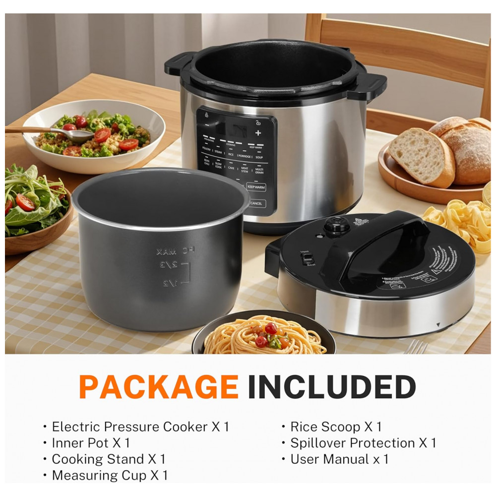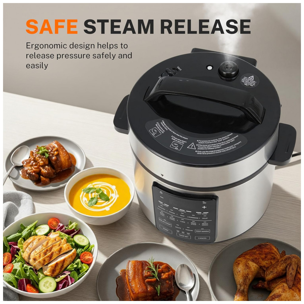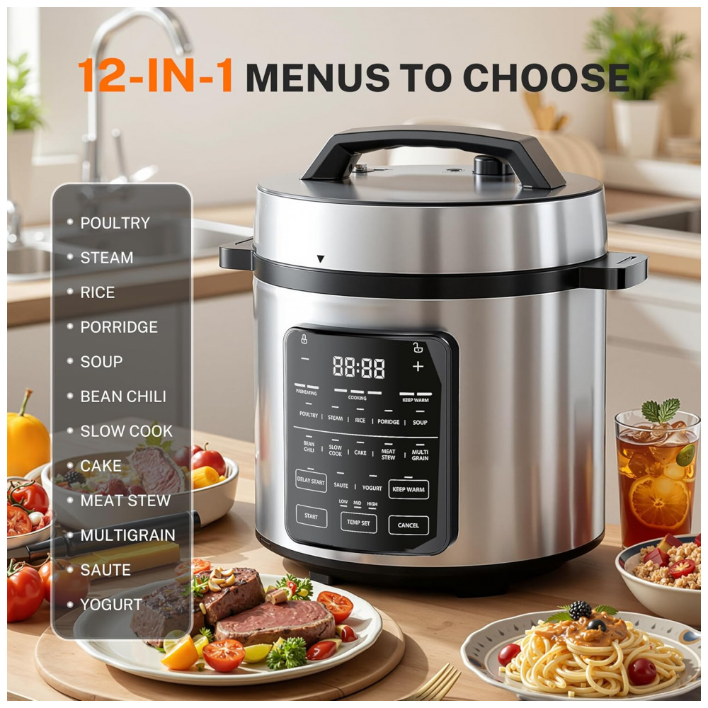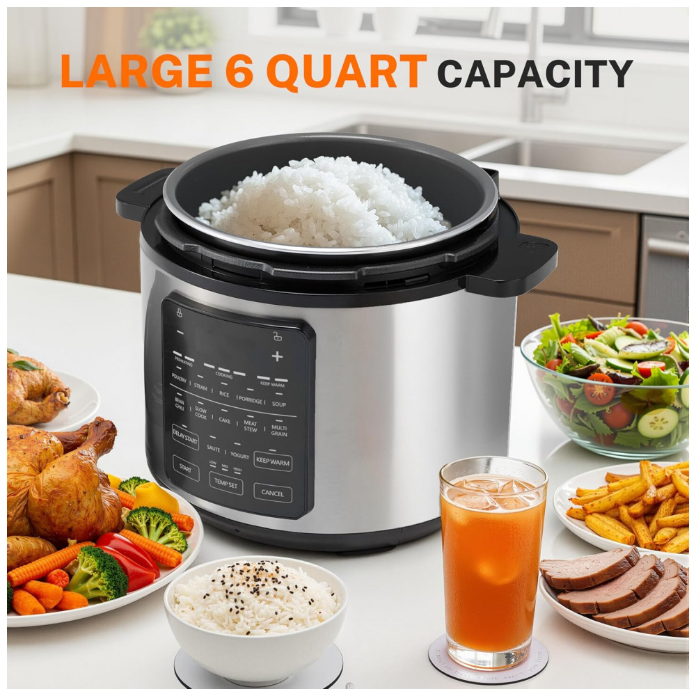 Funcionalidade Versátil 14 em 1: Esta panela de pressão elétrica é a solução completa para sua cozinha. Com 14 funções de cozimento pré-definidas, combina as capacidades de uma panela de arroz, fogão lento, cozinha a vapor, frigideira, fabricante de iogurte e muito mais. Prepare ensopados substanciais, arroz fofinho ou iogurte cremoso, este eletrodoméstico lida com tudo perfeitamente. Capacidade Familiar Perfeita: Com capacidade para 6 litros, essa panela pode cozinhar até 10 xícaras de arroz cru, 1,6 kg de carne ou um frango inteiro, sendo perfeitamente dimensionada para preparar refeições para famílias, festas ou qualquer outra atividade ao ar livre. Construção Durável em Aço Inoxidável: Construída com aço inoxidável de alta qualidade, esta panela foi feita para durar. O design moderno e elegante resiste à ferrugem e manchas, tornando-a uma adição durável e atraente para qualquer cozinha, oferecendo qualidade confiável para o prazer culinário de sua família. Design Seguro para Lava-Louças: Limpar após cozinhar nunca foi tão fácil. O recipiente interno antiaderente evita que os alimentos grudem, enquanto o design seguro para lava-louças permite que você simplesmente coloque o recipiente e a tampa na lava-louças para uma limpeza sem complicações. Recursos de Segurança Aprimorados: Sua segurança é a nossa prioridade. Equipada com 16 tipos de proteção, incluindo válvula de liberação de pressão, sistema de travamento de segurança e proteção contra superaquecimento, esta panela de pressão garante tranquilidade ao entregar resultados perfeitos. Cozinhe com confiança, sabendo que cada recurso foi projetado pensando na sua segurança.