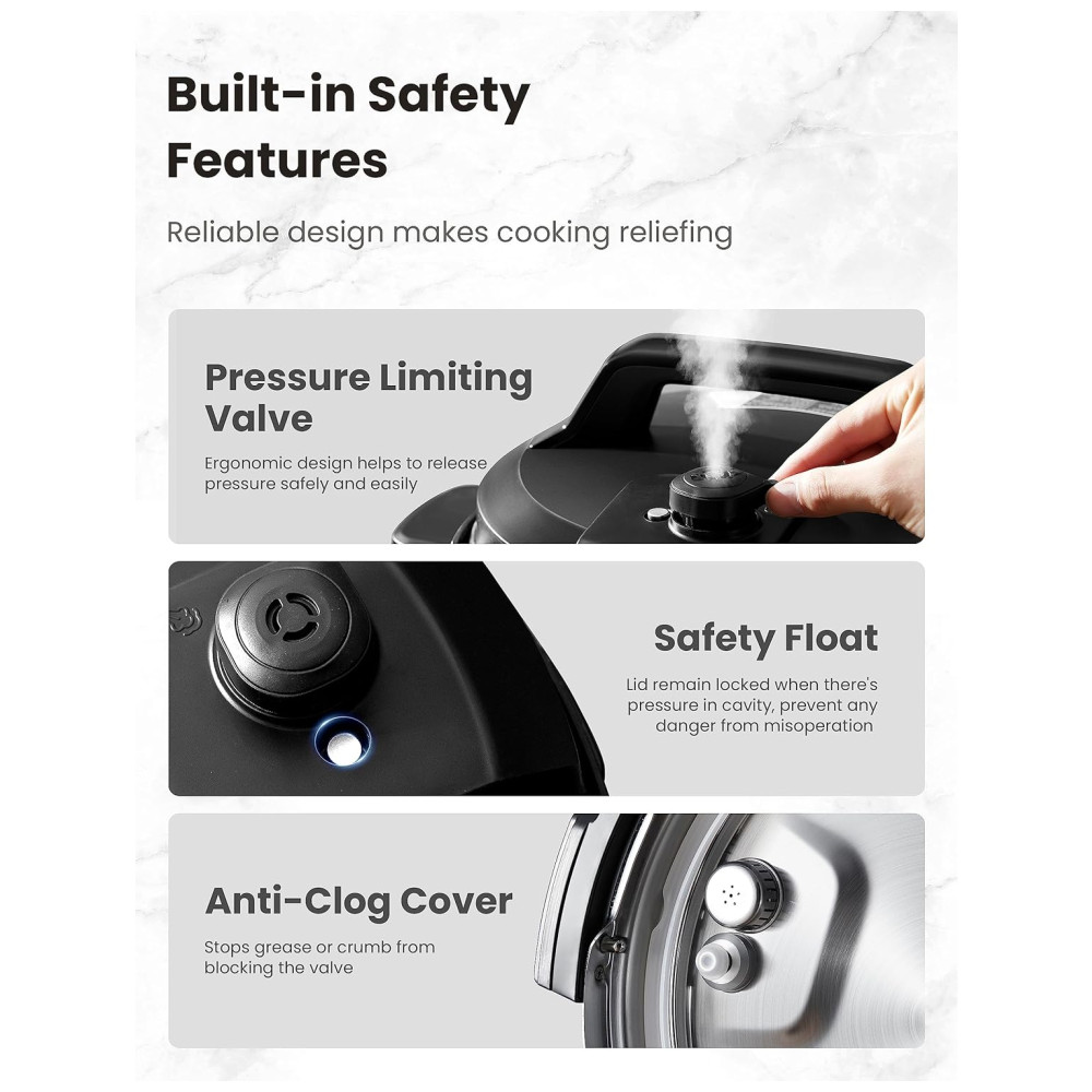 RECURSOS DE SEGURANÇA PROFISSIONAIS: Equipado com 10 recursos de segurança, incluindo proteção contra superaquecimento, liberação automática de pressão e sistema de trava de segurança da tampa, para que você cozinhe com tranquilidade e segurança.