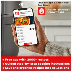 DESCUBRA RECEITAS INCRÍVEIS: Acompanha o aplicativo gratuito Instant Brands Connect, onde você pode explorar novas receitas rápidas e deliciosas, disponível para iOS e Android.