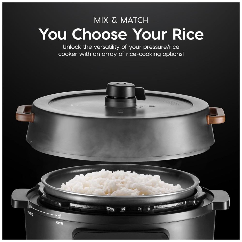 Panela 8 em 1: Além de cozinhar arroz, esta panela funciona como uma panela de pressão multifuncional, oferecendo 8 modos diferentes: Cozinhar sob Pressão, Cozinhar Lentamente, Cozinhar sem Água, Cozinhar com Temperatura Controlada, Cozinhar Grãos, Selar/Frigir, Cozinhar a Vapor, Fermentar e Aquecer.