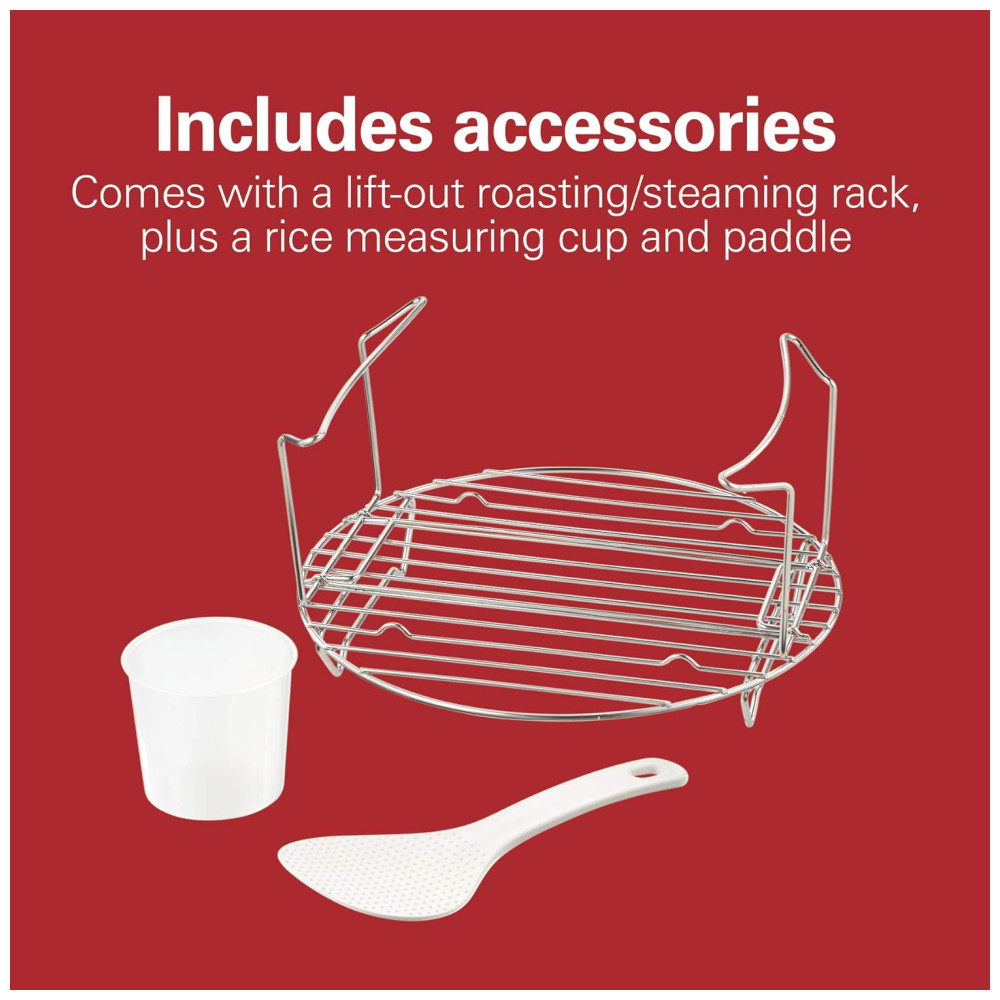 Acessórios Incluídos: Acompanha uma grade para assar/cozinhar a vapor carnes ou vegetais, além de uma espátula e um copo medidor de arroz.