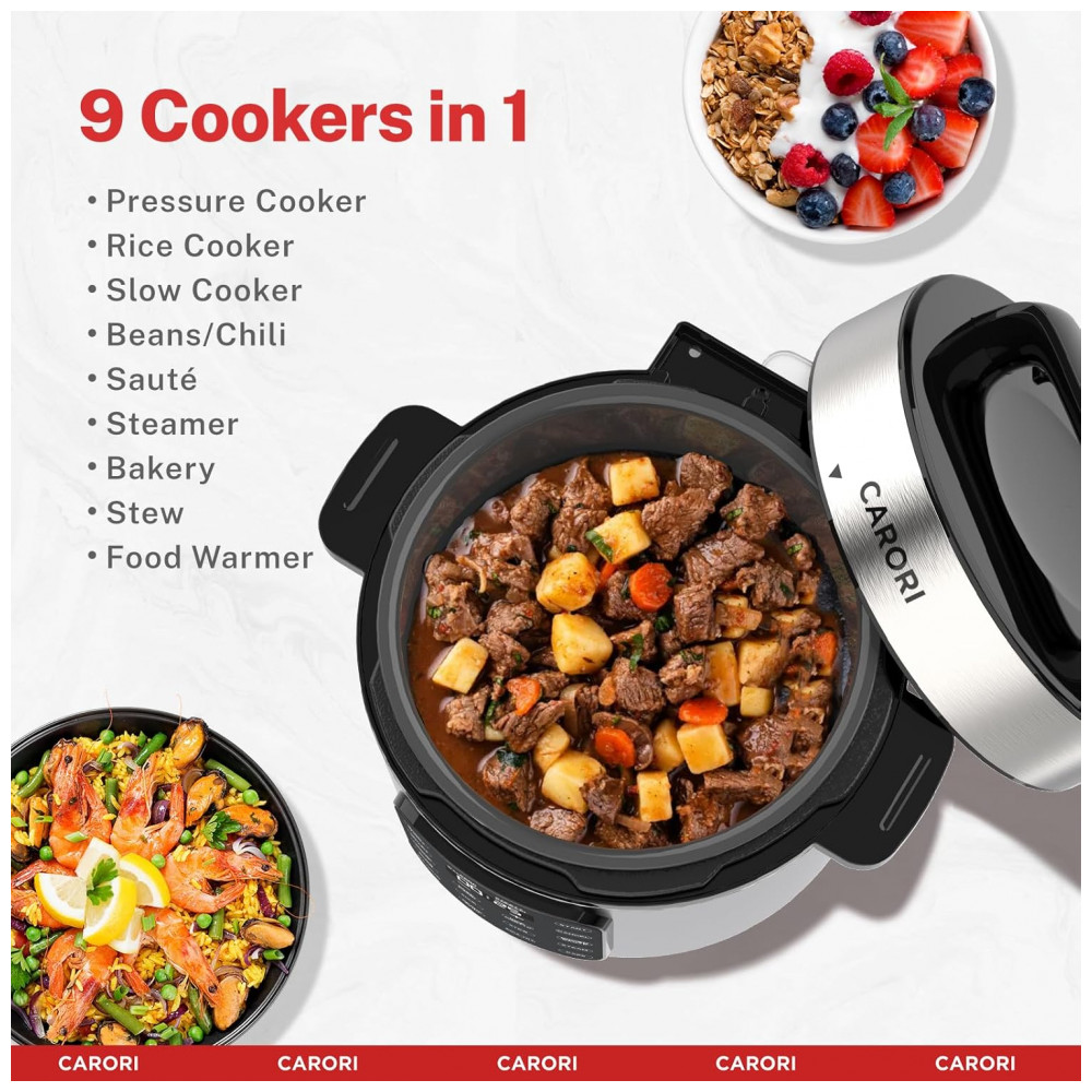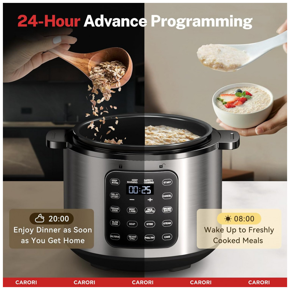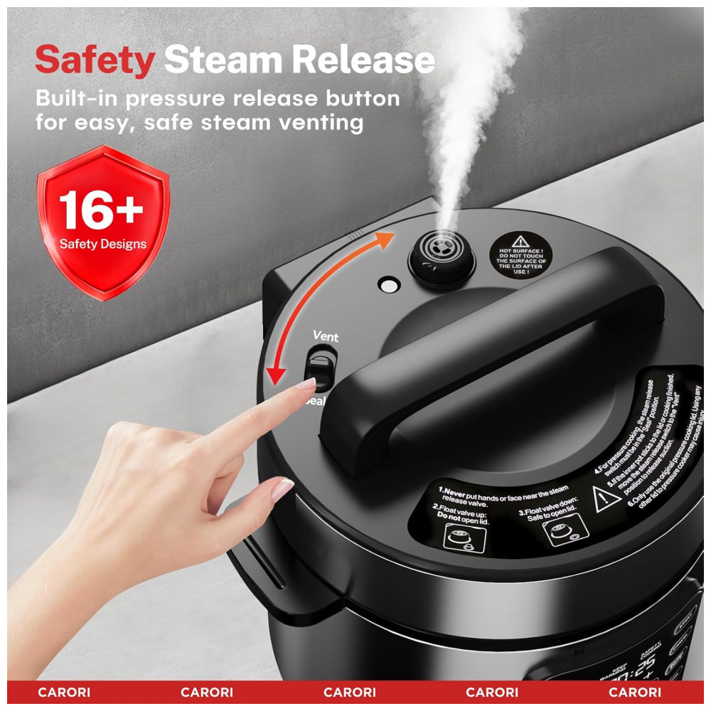 A Panela de Pressão 9 em 1 oferece a conveniência de múltiplas funções de cozimento em um único aparelho elétrico, ideal para cozinhar sob pressão, preparar arroz, cozinhar lentamente, refogar, vaporizar, assar, esterilizar e manter alimentos aquecidos. Com uma tela sensível ao toque IMD de alta definição, esta panela de pressão oferece controle fácil e preciso. Com 1000 watts de potência, ela cozinha até 70% mais rápido que métodos tradicionais, mantendo os nutrientes dos alimentos. Com mais de 16 recursos de segurança embutidos, incluindo botão de liberação de vapor, trava de segurança na tampa, proteção contra superaquecimento e design à prova de vazamentos, garantindo uma experiência de cozimento segura e tranquila. Com capacidade de 6 litros, esta panela de pressão serve facilmente até 6 pessoas, ideal para jantares em família, festas de feriado ou porções menores para uma pessoa. Agende suas refeições com até 24 horas de antecedência, facilitando o planejamento da sua rotina. A panela possui revestimento interno antiaderente cerâmico, livre de PFAS e BPA, facilitando a limpeza e reduzindo a necessidade de óleo ou manteiga em excesso, atraindo os amantes da alimentação saudável. A aparência em aço inoxidável da panela é resistente a impressões digitais, e tanto a panela quanto a tampa são seguras para lava-louças, tornando a limpeza muito mais simples. O pacote inclui: 1 panela de pressão elétrica, 1 panela antiaderente de cerâmica, 1 copo de condensação, 1 rack de vapor, 1 copo medidor, 1 colher de arroz, 1 livro de receitas, 1 manual do usuário e 1 cabo de energia.