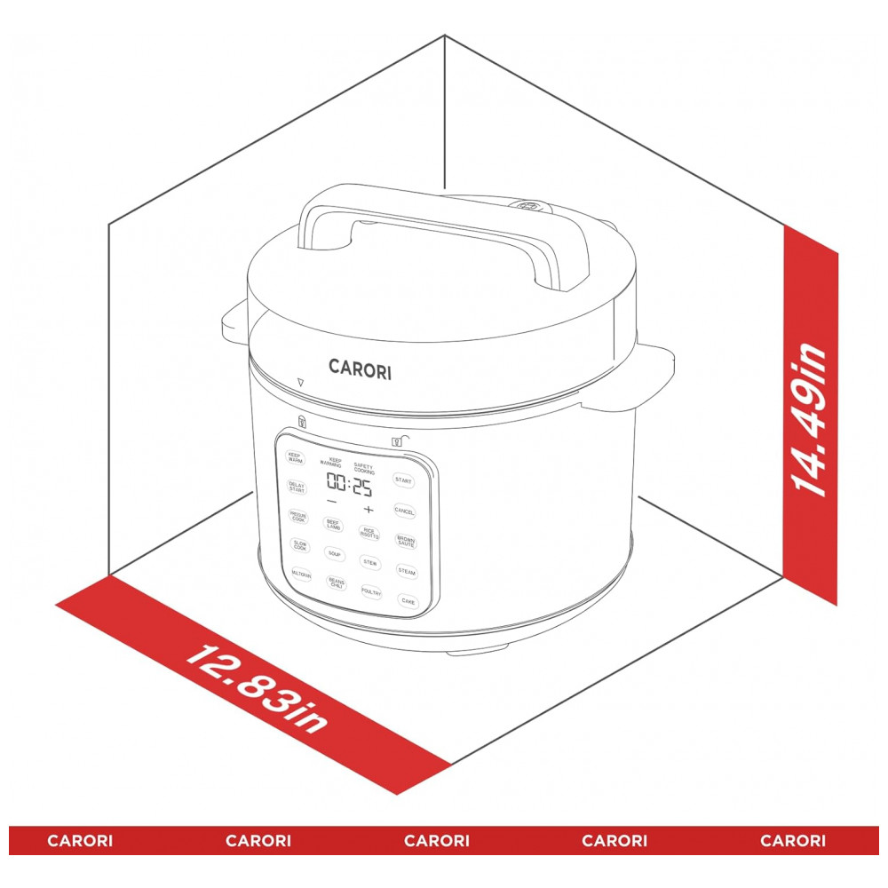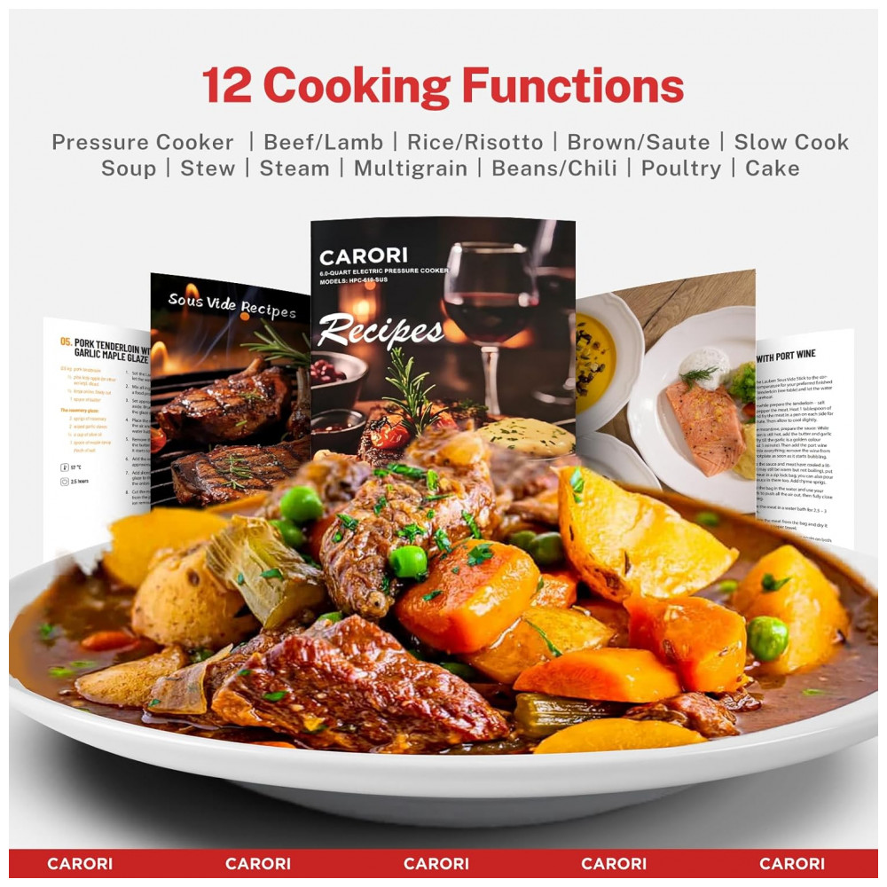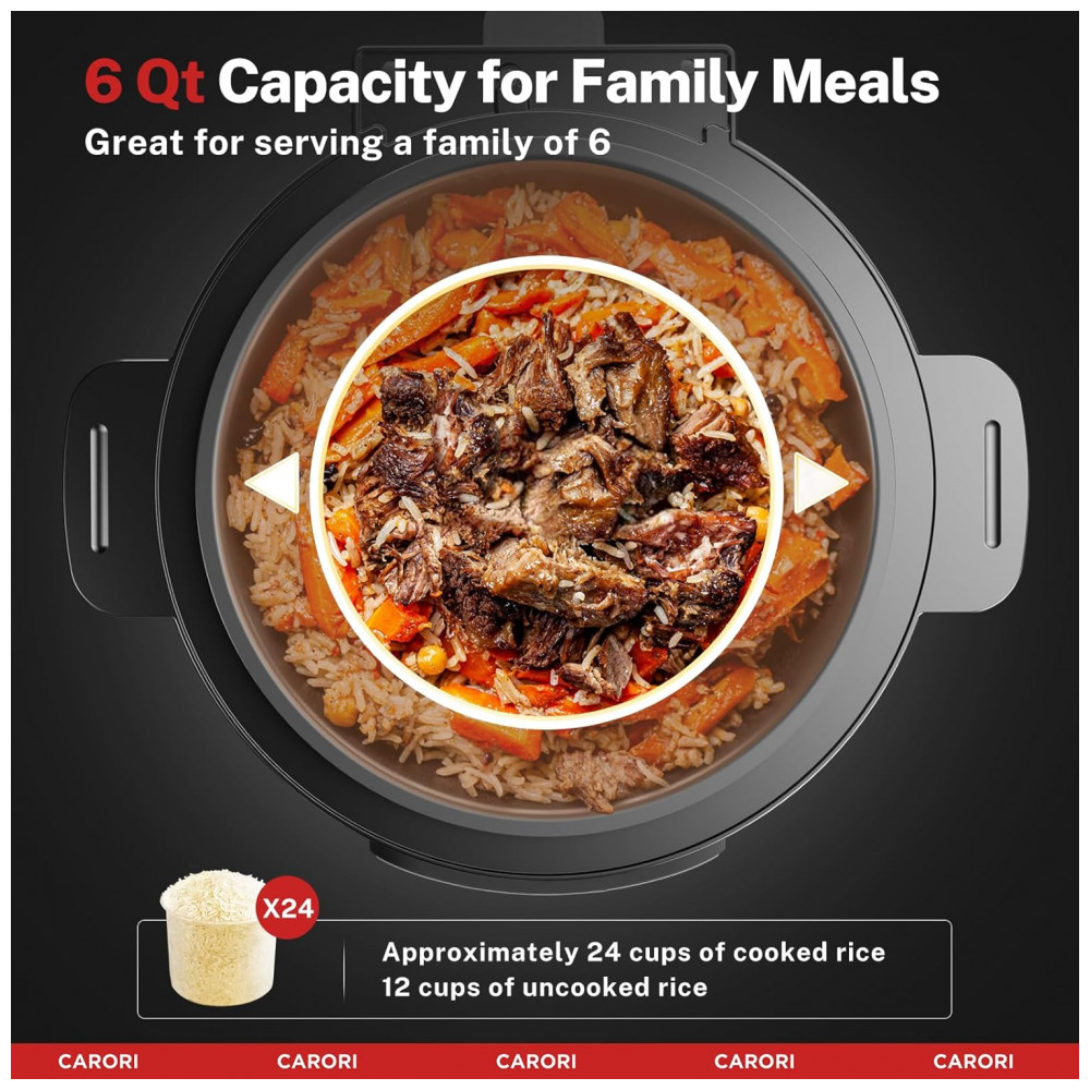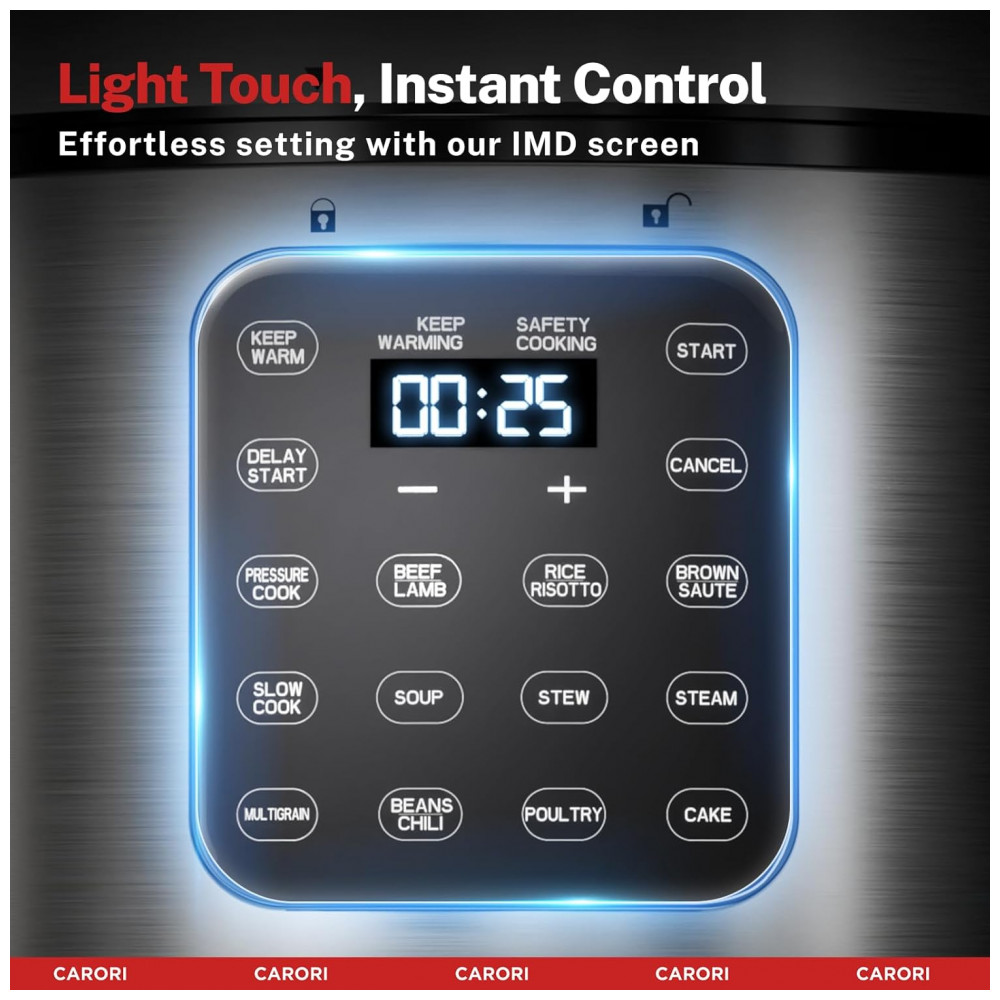 A Panela de Pressão 9 em 1 oferece a conveniência de múltiplas funções de cozimento em um único aparelho elétrico, ideal para cozinhar sob pressão, preparar arroz, cozinhar lentamente, refogar, vaporizar, assar, esterilizar e manter alimentos aquecidos. Com uma tela sensível ao toque IMD de alta definição, esta panela de pressão oferece controle fácil e preciso. Com 1000 watts de potência, ela cozinha até 70% mais rápido que métodos tradicionais, mantendo os nutrientes dos alimentos. Com mais de 16 recursos de segurança embutidos, incluindo botão de liberação de vapor, trava de segurança na tampa, proteção contra superaquecimento e design à prova de vazamentos, garantindo uma experiência de cozimento segura e tranquila. Com capacidade de 6 litros, esta panela de pressão serve facilmente até 6 pessoas, ideal para jantares em família, festas de feriado ou porções menores para uma pessoa. Agende suas refeições com até 24 horas de antecedência, facilitando o planejamento da sua rotina. A panela possui revestimento interno antiaderente cerâmico, livre de PFAS e BPA, facilitando a limpeza e reduzindo a necessidade de óleo ou manteiga em excesso, atraindo os amantes da alimentação saudável. A aparência em aço inoxidável da panela é resistente a impressões digitais, e tanto a panela quanto a tampa são seguras para lava-louças, tornando a limpeza muito mais simples. O pacote inclui: 1 panela de pressão elétrica, 1 panela antiaderente de cerâmica, 1 copo de condensação, 1 rack de vapor, 1 copo medidor, 1 colher de arroz, 1 livro de receitas, 1 manual do usuário e 1 cabo de energia.