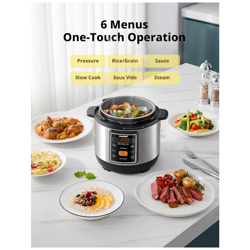 Panela de Pressão Elétrica COMFEE 7 em 1 Fogão Lento Vaporizador Refogador Sous Vide Aquecedor Multicooker com Panela Antiaderente de Cerâmica