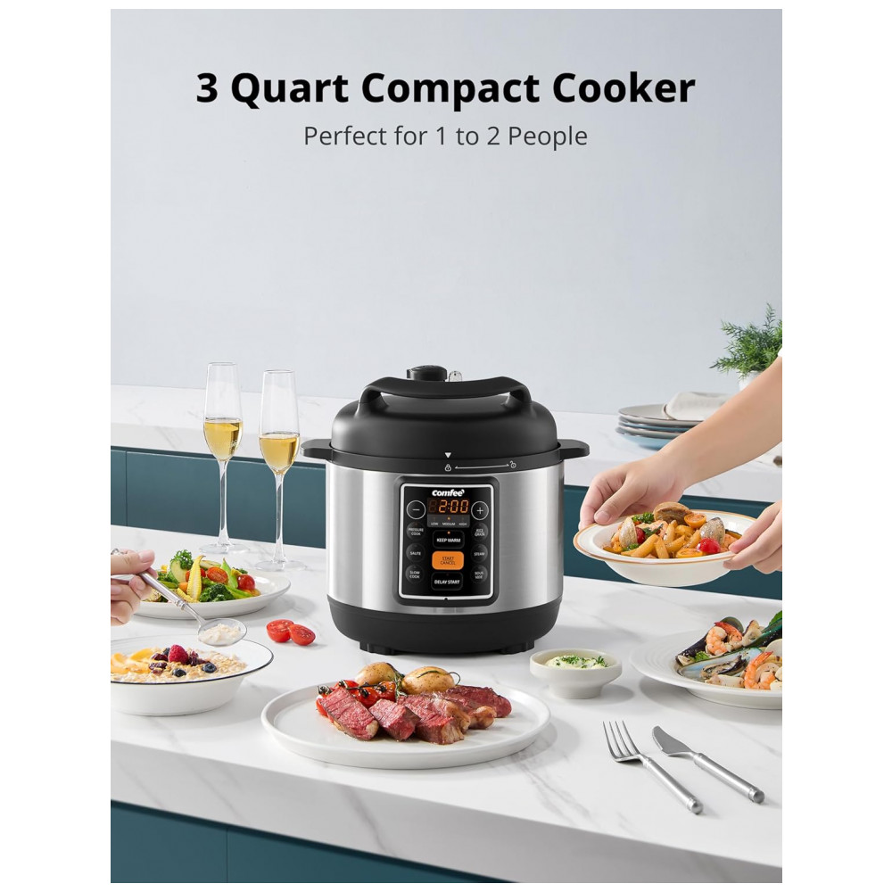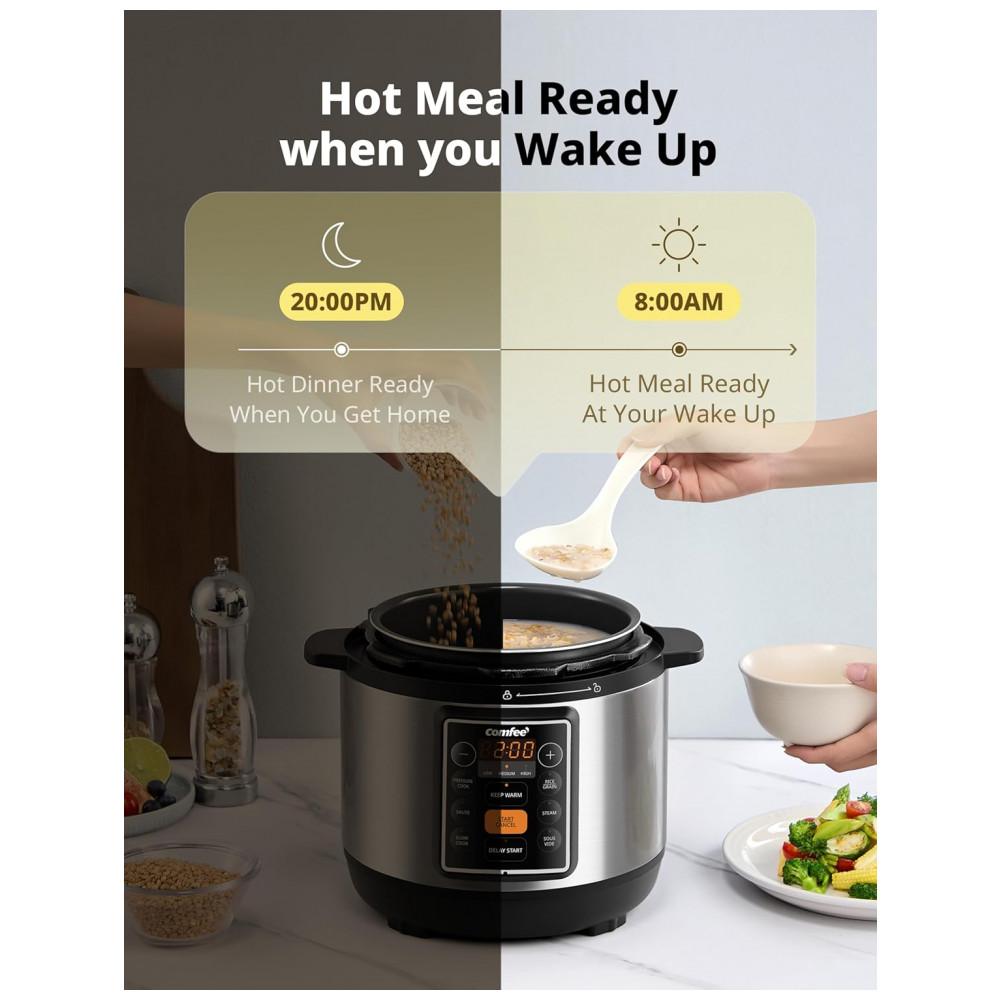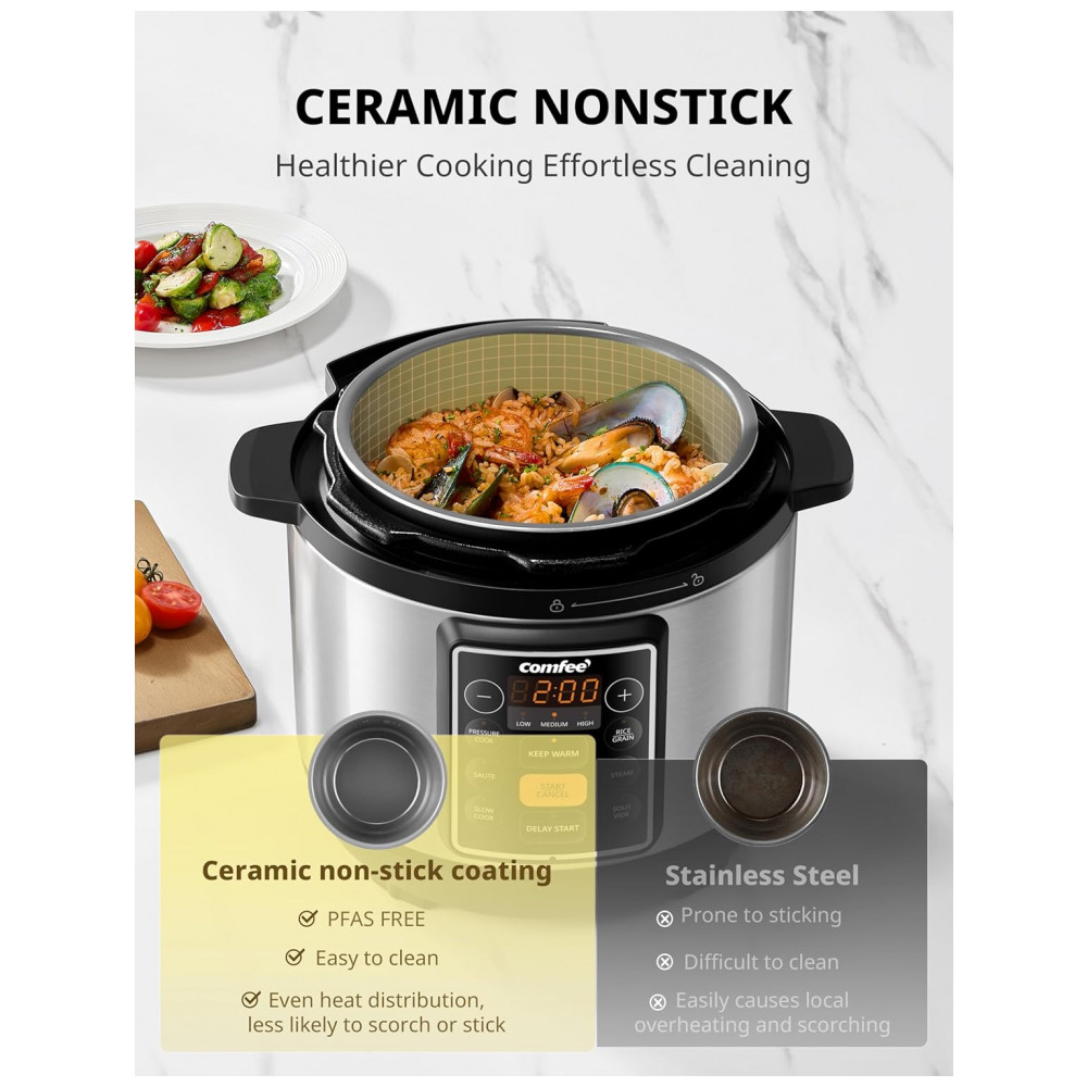A Panela de Pressão Elétrica COMFEE 7 em 1 oferece versatilidade incomparável: pressão, preparo de arroz, refogar, cozimento lento, sous vide, ou vaporizar alimentos em um único aparelho essencial. Substitua a bagunça na bancada com essa potência versátil para refeições caseiras. Função Precision Sous Vide desbloqueie resultados de qualidade de restaurante em casa com cocção precisa em baixa temperatura. Ingredientes cozinham uniformemente em seus próprios sucos, preservando a umidade natural, aumentando a maciez e intensificando os sabores para carne, peixe ou legumes. Alcance um resultado perfeito todas as vezes. Panela com Revestimento de Cerâmica durável promove aquecimento uniforme e preserva o sabor e os nutrientes dos alimentos. Suas propriedades não reativas, fácil manutenção e limpeza sem esforço são ideais para uso diário. Programas Inteligentes Intuitivos, com múltiplos modos predefinidos, simplificam o preparo do café da manhã, almoço ou jantar. Operação com um toque e configurações personalizáveis atendem a todos os níveis de habilidade culinária. O tamanho de 3 litros é ideal para residências menores ou acompanhamentos. Proteção Avançada de 9 Pontos inclui limites de pressão, controle de temperatura e liberação automática de pressão, garantindo um cozimento sem preocupações. Limpeza Sem Complicações: Panela interna e tampa são laváveis na lava-louças para uma limpeza rápida e simples. Cozimento em Uma Panela: Alcance resultados em uma panela significativamente mais rápidos do que métodos convencionais, perfeito para preparar pratos em minutos nos dias corridos.