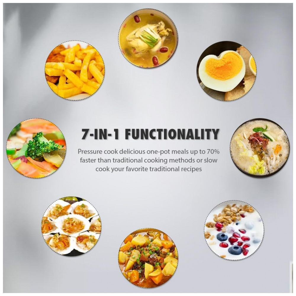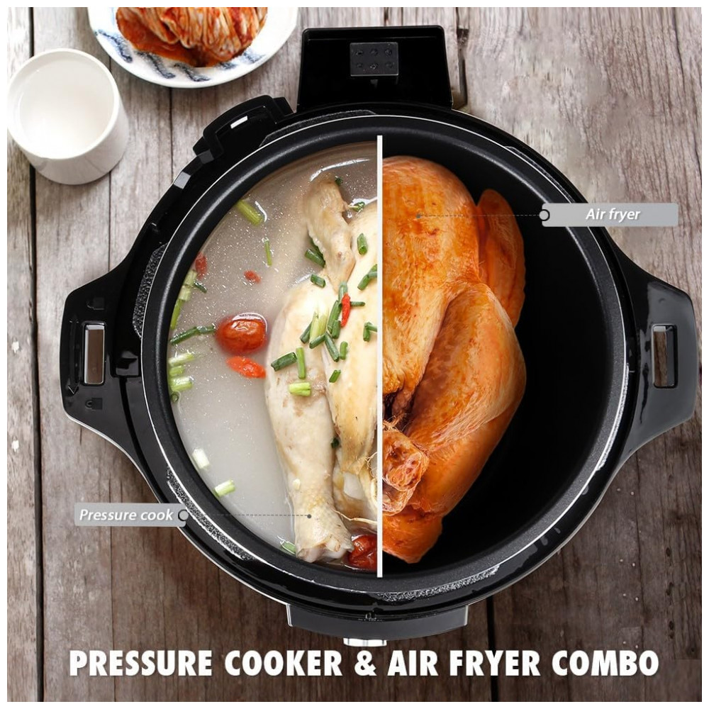 Tudo em um! A combinação dos sonhos entre panela de pressão e fritadeira de ar proporciona a você uma utensílio de cozinha multifuncional mais conveniente, economizador de tempo e de espaço. Esta panela inovadora combina vapor, cozimento sob pressão, cozimento lento, fritura crocante, desidratação, assados e muito mais. Prepare pratos deliciosos com sabores incríveis para você e sua família. Possui 2 tampas removíveis, fáceis de alternar entre a tampa de pressão e a de fritadeira. Cozinhe com rapidez e praticidade, poupando espaço. Apreciado por familiares e amigos, este conjunto é ideal para cozinhar de forma saudável. A panela oferece diversos modos de cozimento: cozinhar sob pressão mantendo a maciez, fritar com crocância e pouco óleo, refogar ingredientes para selar carnes e vegetais, cozinhar lentamente em baixa temperatura, cozinhar com vapor, fazer iogurte, manter a comida aquecida e programar o início do cozimento. Acompanha diversas acessórios como cestos, xícaras de medição e colheres. As tampas intercambiáveis permitem alternar entre os modos de cozimento com facilidade. Eleve sua criatividade culinária com métodos versáteis que vão desde assados suculentos até petiscos crocantes. Com capacidade extra grande de 7,57 litros para fritura de ar, garante circulação de ar quente ideal para batatas fritas douradas, asas crocantes e legumes assados. Inúmeros menus de cozimento pré-definidos cobrem a maior parte das refeições diárias, incluindo aves, carne, frutos do mar, bacon, alimentos congelados, vegetais, sobremesas, etc. Com a Panela de Pressão Elétrica de 7,57 Litros da prepAmeal, você pode personalizar suas receitas favoritas e criar pratos incríveis.