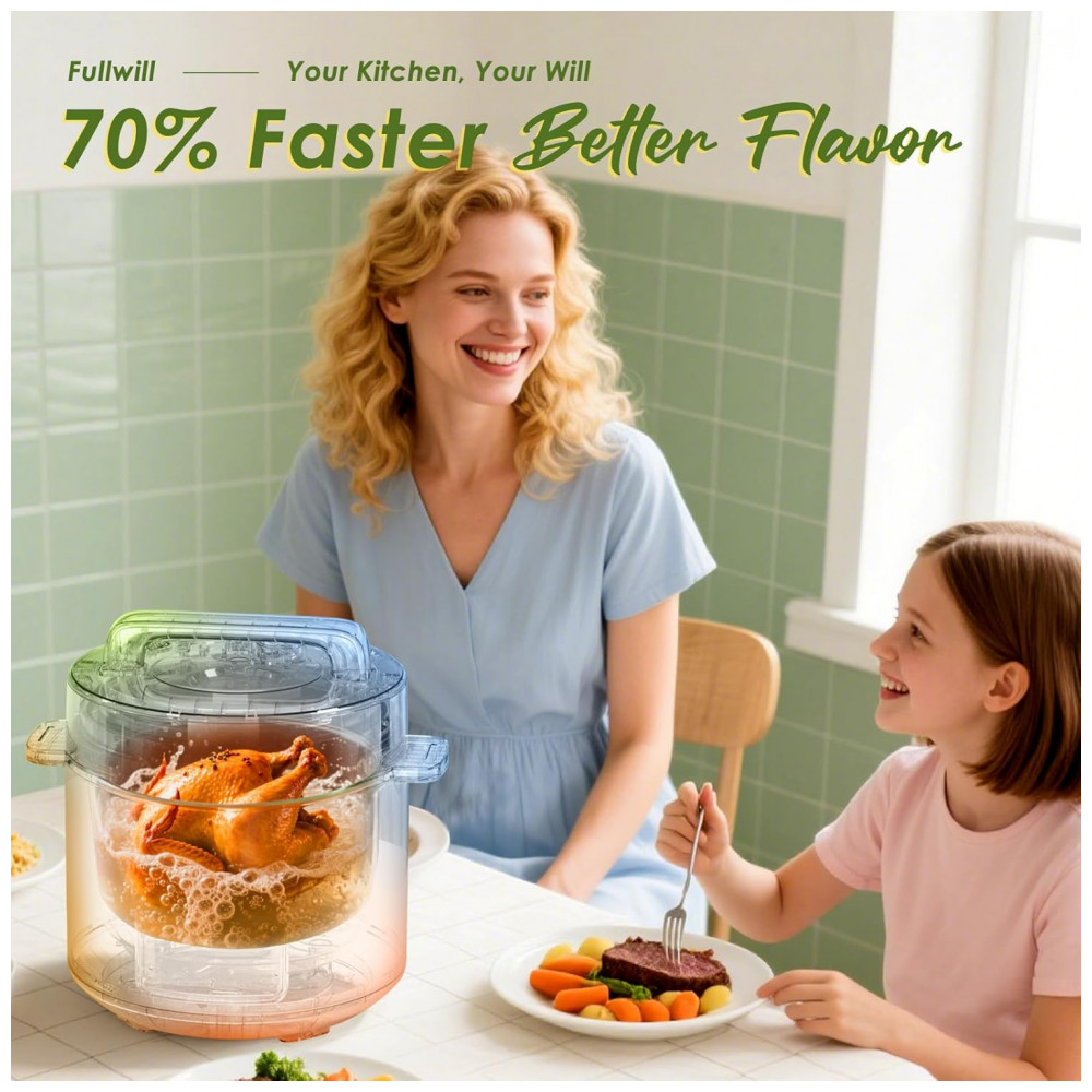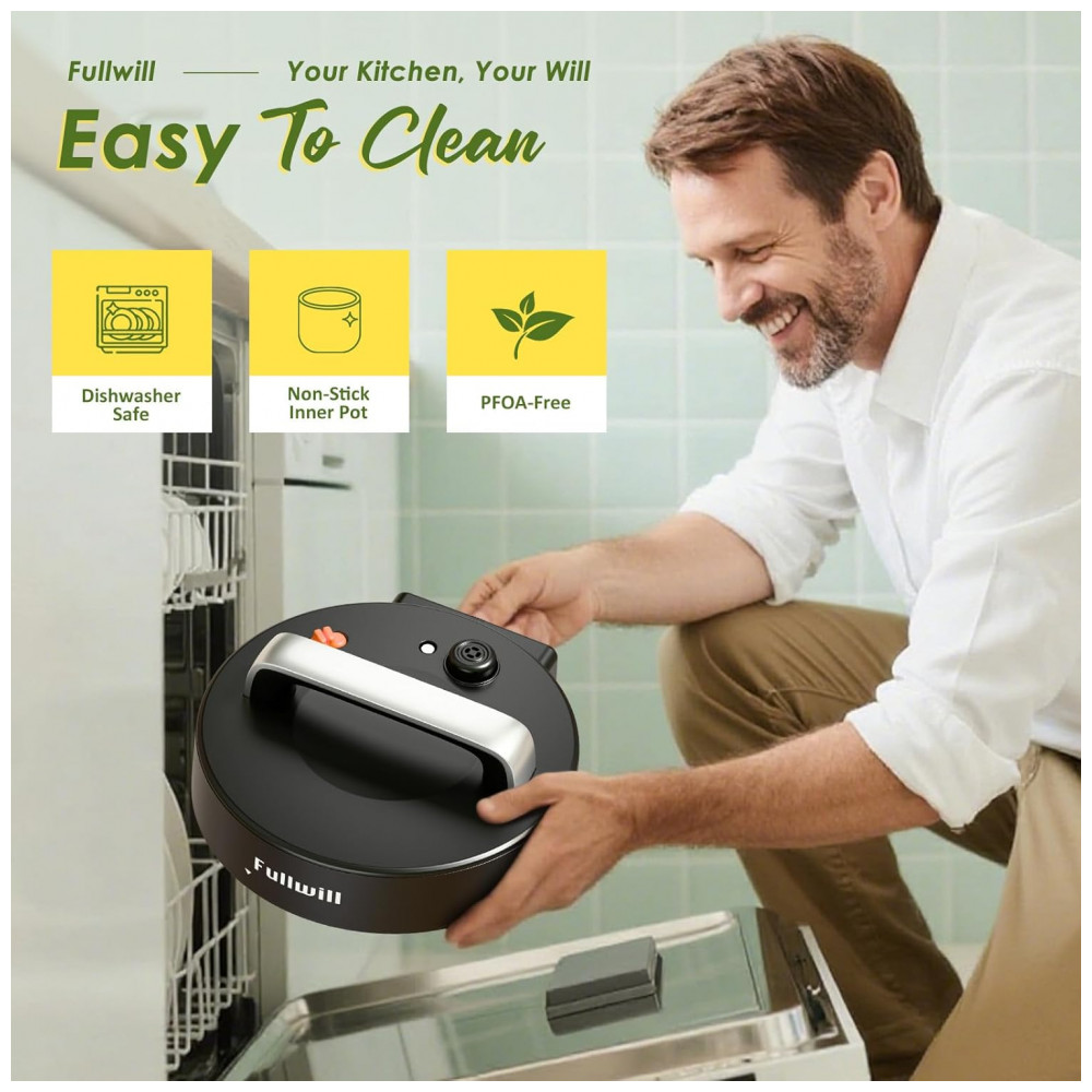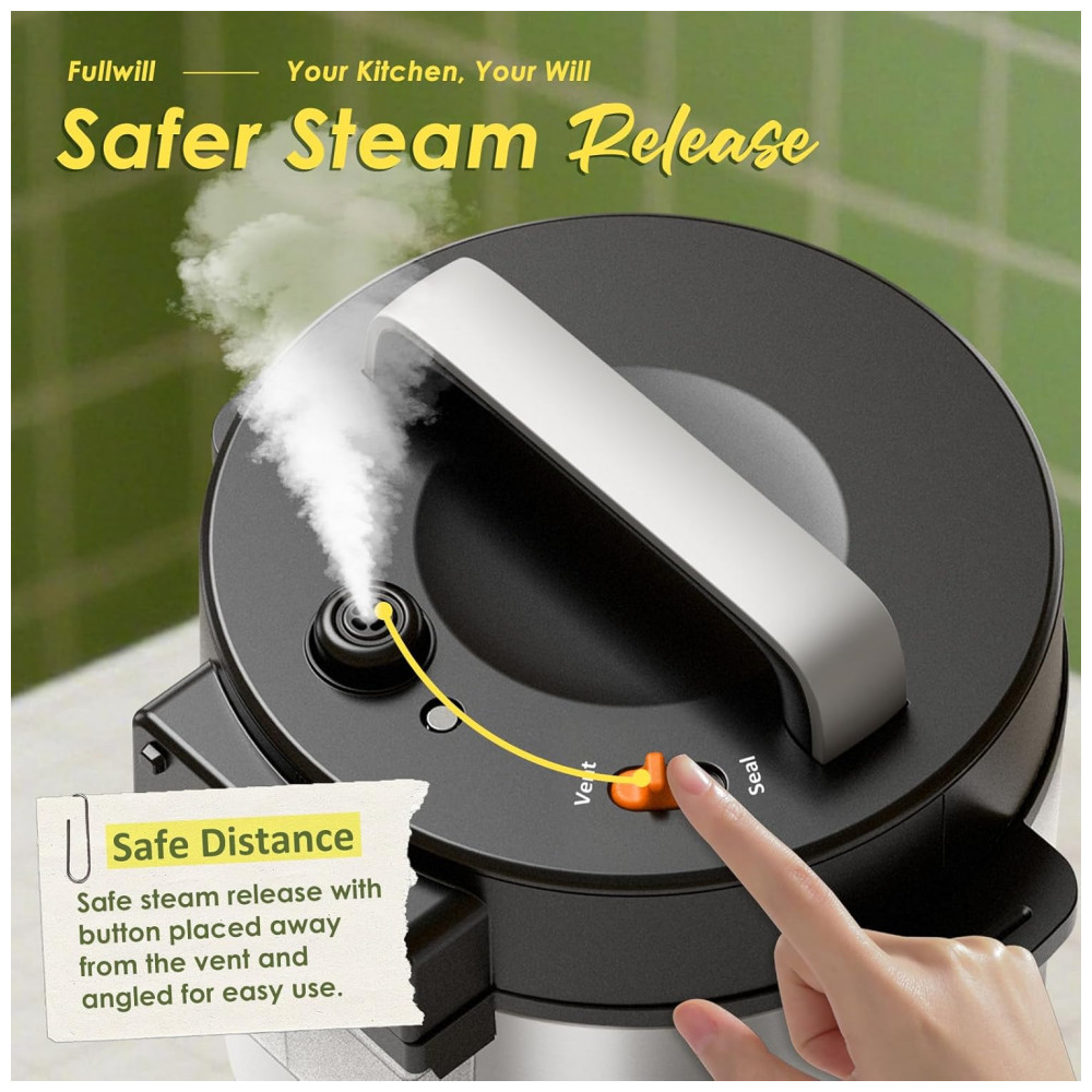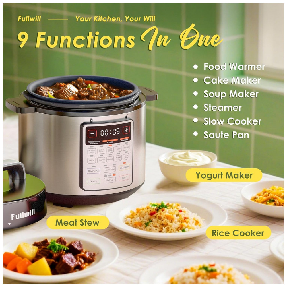 Simplifique sua cozinha e economize muito com a Panela de Pressão Fullwill 9 em 1! Esta potência substitui sua panela de pressão, panela elétrica, panela de arroz, iogurteira, fazedora de bolos, frigideira, vaporizador, aquecedor de alimentos e fabricante de sopas. Cozinhar sem esforço com 12 Programas Inteligentes que preparam refeições perfeitas com o toque de um botão! Escolha entre Cozimento Rápido, Cozimento Lento, Aves, Vapor, Mingau, Sopa, Feijão/Chili, Bolo, Carne/Ensopado, Arroz/Grãos, Refogar ou Iogurte. Limpeza fácil e culinária mais saudável com a panela interna durável antiaderente livre de PFOA, carcaça em aço inoxidável resistente a impressões digitais e acessórios laváveis na lava-louças. Prepare refeições instantâneas em uma única panela e tenha o jantar pronto até 70 mais rápido do que o método tradicional! Cozinhe com tranquilidade e segurança, com mais de 10 recursos de segurança embutidos, incluindo proteção contra superaquecimento, trava de segurança na tampa e controle de pressão. Manual detalhado e livro de receitas inclusos para facilitar o uso. Tamanho familiar de 6 litros, perfeito para 4-6 pessoas, refeições familiares ou preparação semanal. Cozinhe uma vez, sirva a todos.