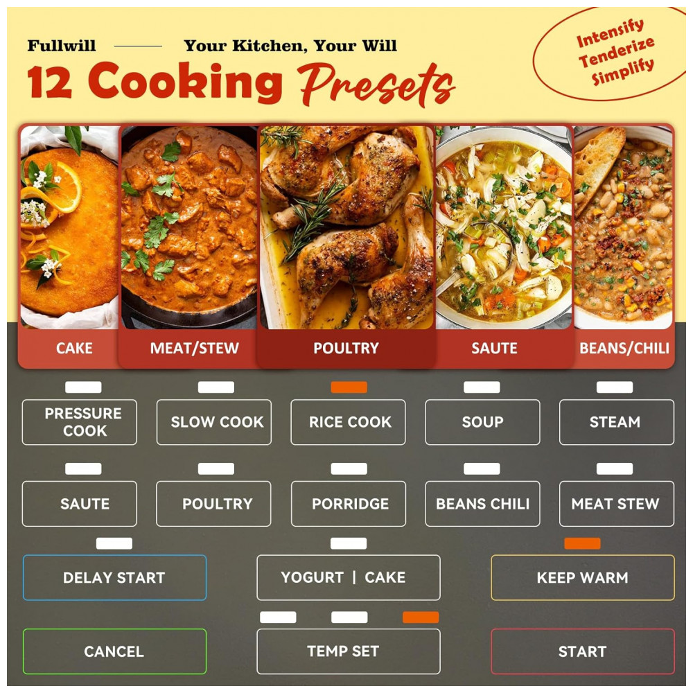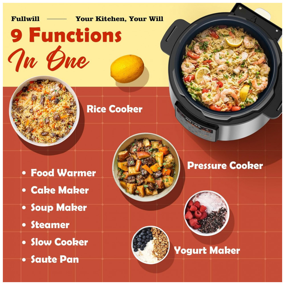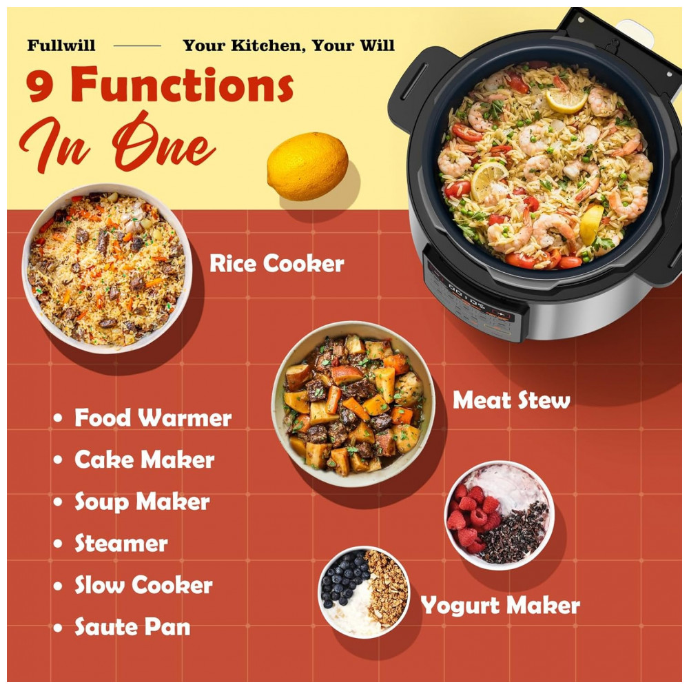 Desfrute de 9 eletrodomésticos em 1 com a Panela de Pressão Fullwill: panela de pressão, panela de cozimento lento, panela de arroz, fabricante de iogurte, fabricante de bolo, frigideira para refogar, cozinha a vapor, aquecedor de comida e preparador de sopas. Com 12 programas pré-definidos personalizáveis, incluindo cozimento rápido, cozimento lento, aves, vapor, mingau, sopa, feijão/chili, bolo, carne/guisado, arroz/grãos, refogar e iogurte, oferecendo máxima versatilidade para diversas necessidades culinárias. Cozinha refeições até 70 mais rápido que os métodos tradicionais, economizando energia e tempo, ideal para estilos de vida agitados. Possui mais de 10 recursos de segurança, proteção contra superaquecimento, trava de segurança de tampa e controle de pressão. O botão SealVent está posicionado longe da válvula de liberação de vapor, e o design de liberação de vapor inclinado para trás garante uma liberação mais segura, sem riscos de queimaduras. Design saudável sem PFOA, com uma panela interna antiaderente livre de produtos químicos nocivos. Fácil de limpar, com estrutura em aço inoxidável resistente a impressões digitais e tampa, panela interna e acessórios próprios para lava-louças, garantindo uma limpeza sem esforço. Com capacidade familiar de 6 litros, perfeita para preparar refeições para famílias ou grandes eventos.